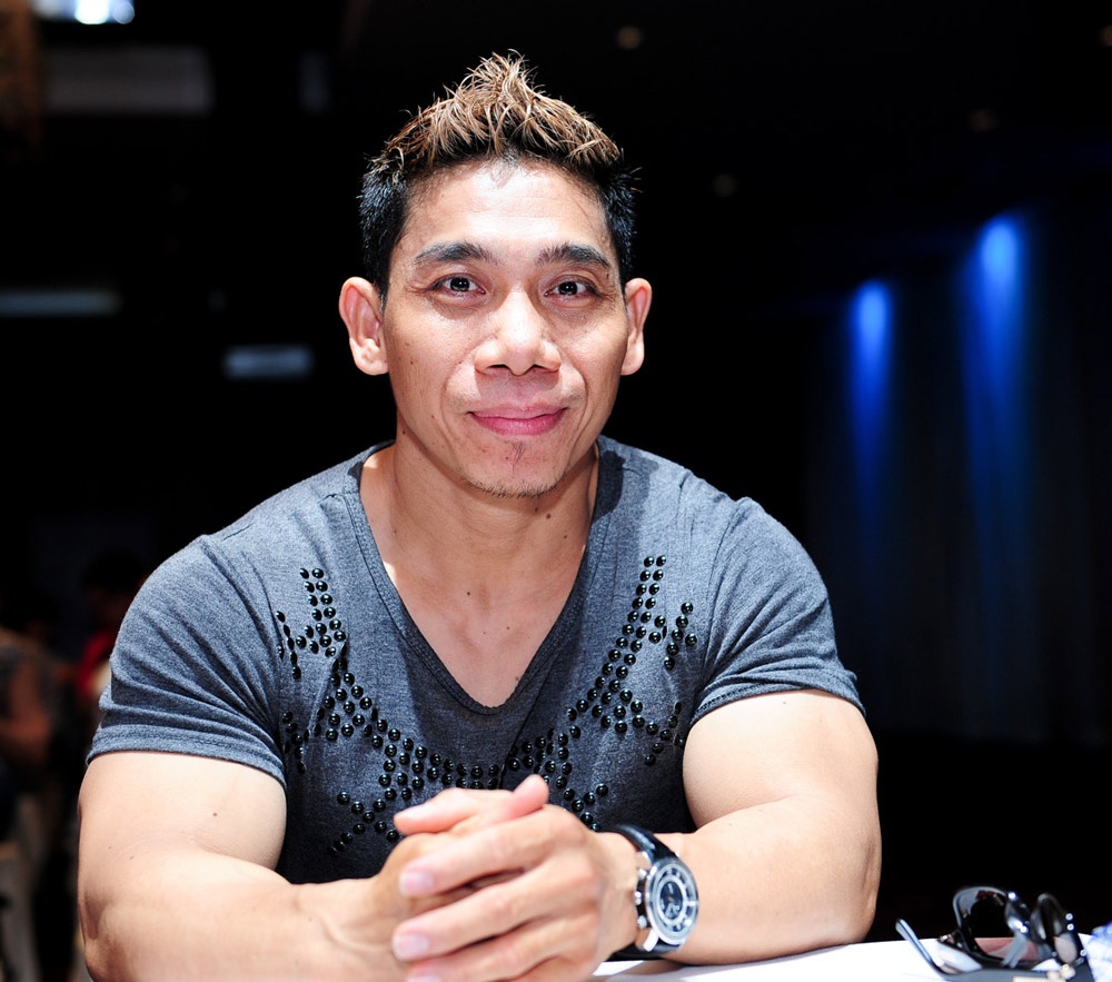 | Phạm Văn Mách khoe cơ bắp lực lưỡng khi đến họp báo. |