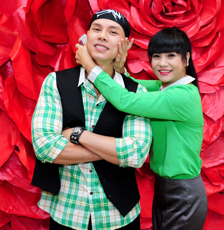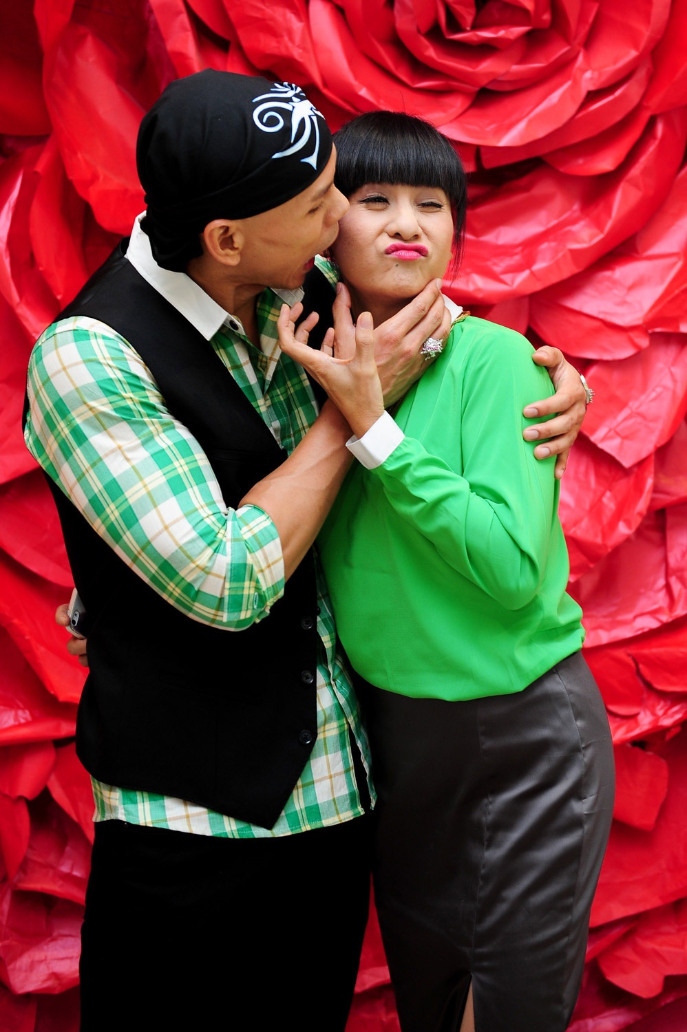 Nam ca sĩ "Bởi vì anh yêu em" hôn má và hôn vai trần gợi cảm của Thái Ngọc Bích trong buổi họp báo giới thiệu liveshow kỷ niệm 10 năm ca hát, ngày 24/9 tại TP.HCM.