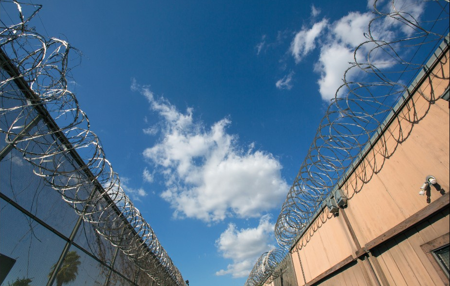 | Dây thép gai trên bức tường bên ngoài một trung tâm giáo dưỡng trẻ vị thành niên ở thành phố Los Angeles. |