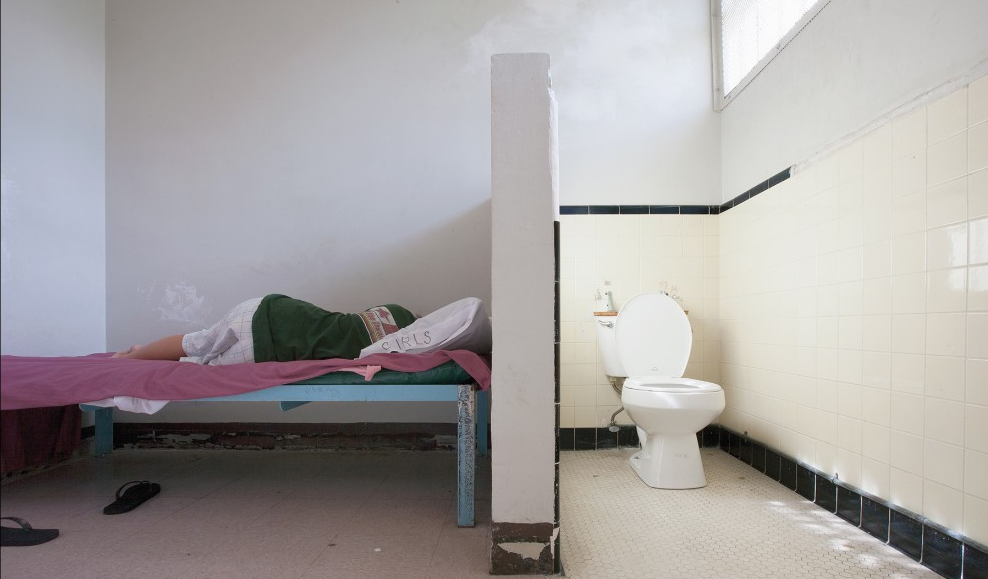 | Một thiếu nữ 16 tuổi ngồi trong trung tâm cải tạo trẻ vị thành niên. Richard Ross, tác giả của bộ ảnh, chỉ gọi cô là E.B, hai chữ cái đầu tiên của tên. "Tôi đã vào đây 17 lần", thiếu nữ kể. |