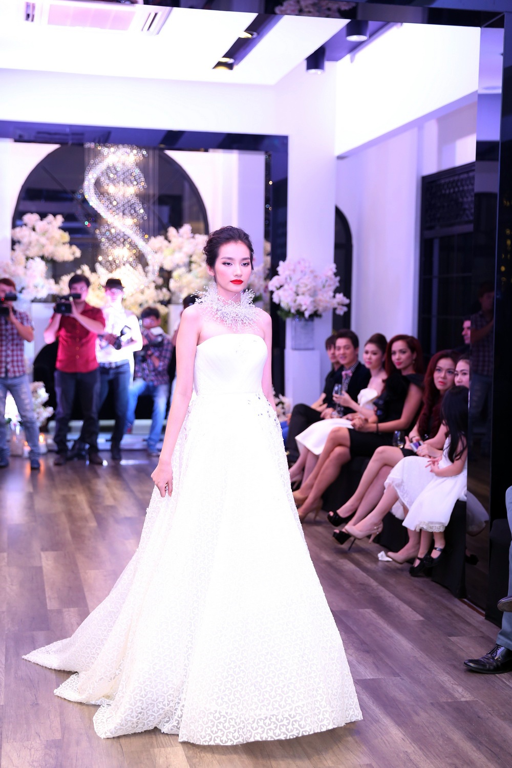 Thiết kế của Chung Thanh Phong mang đậm phong cách lãng mạn, nữ tính và sang trọng. Anh thích dùng cách đính hạt để làm nổi bật trang phục và vóc dáng người mặc. Người mẫu Trang Phạm trình diễn thiết kế này.