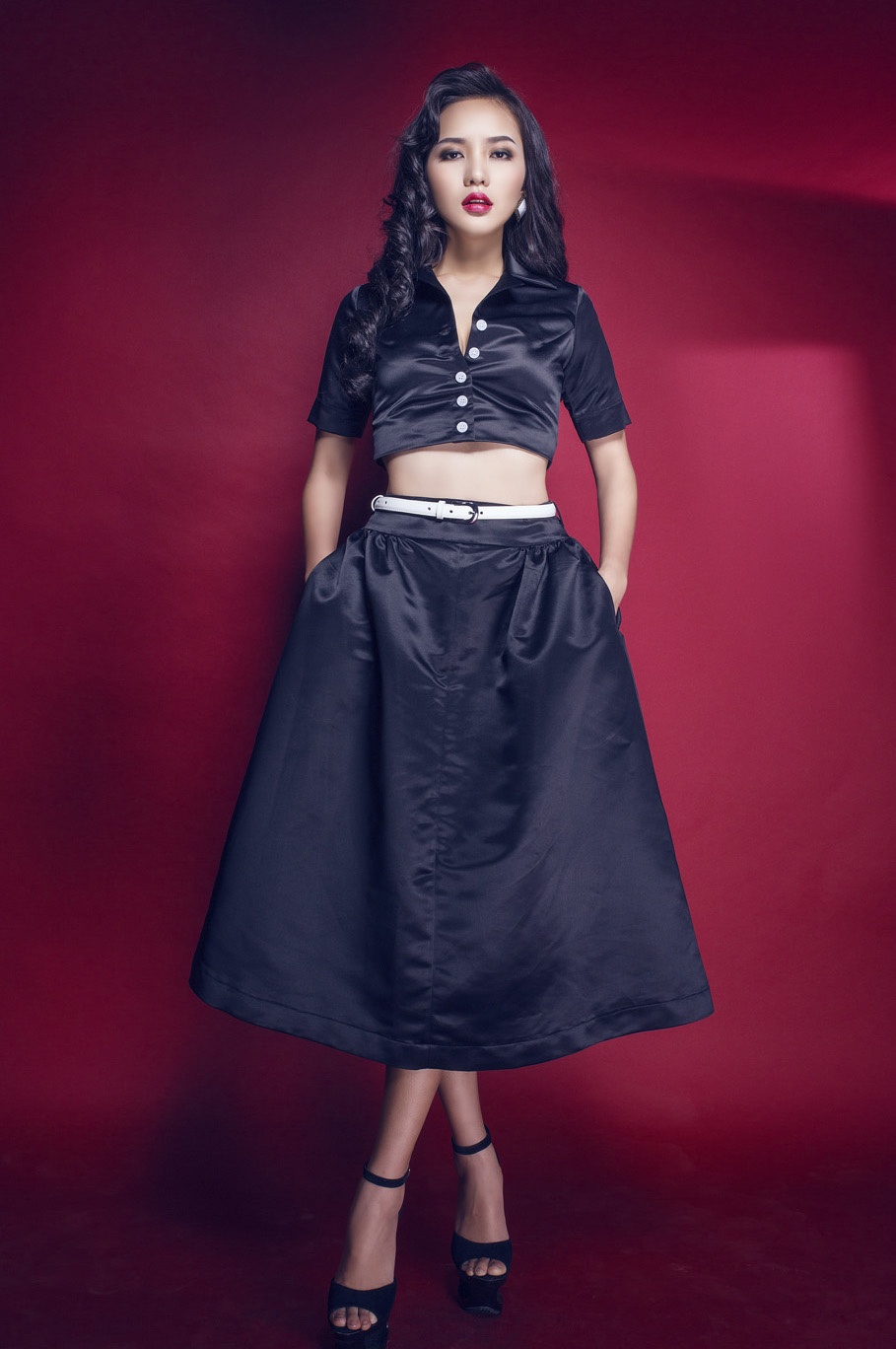| Người đẹp đảm nhận vai trò thể hiện chính cho BST lần này. Trong ảnh, cô diện mẫu váy chất liệu da hiện đại, có đường tà sau sáng tạo và mới mẻ, phối hợp cùng chân váy lạ mắt là áo thun đơn giản, tạo hình ảnh cá tính. |