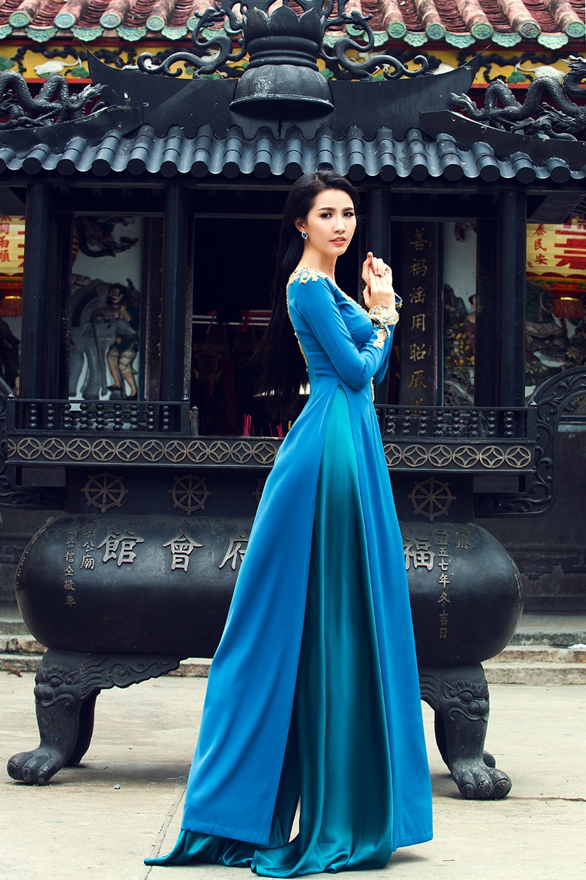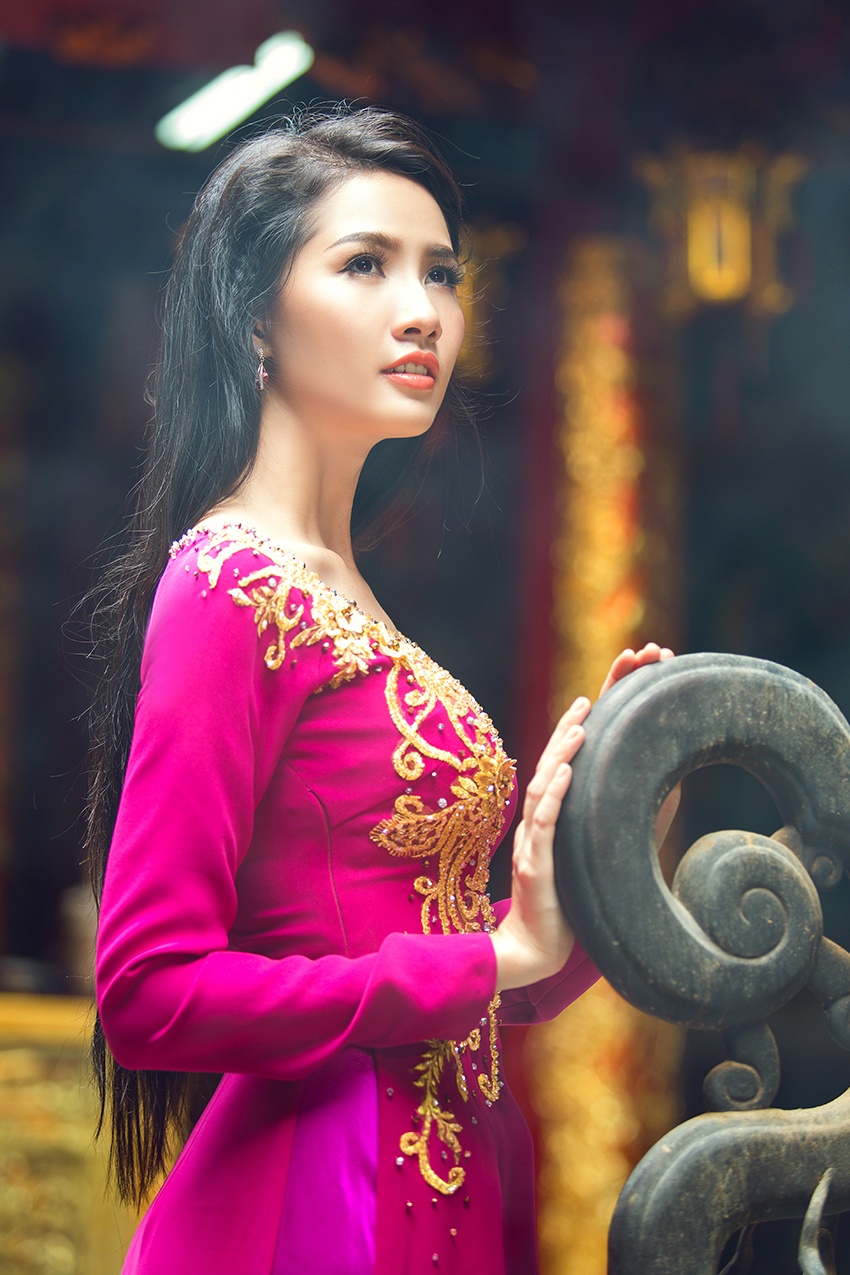 | Trong bộ ảnh giới thiệu thiết kế áo dài truyền thống, Phan Thị Mơ nổi bật bởi nét nhẹ nhàng, sâu lắng. |