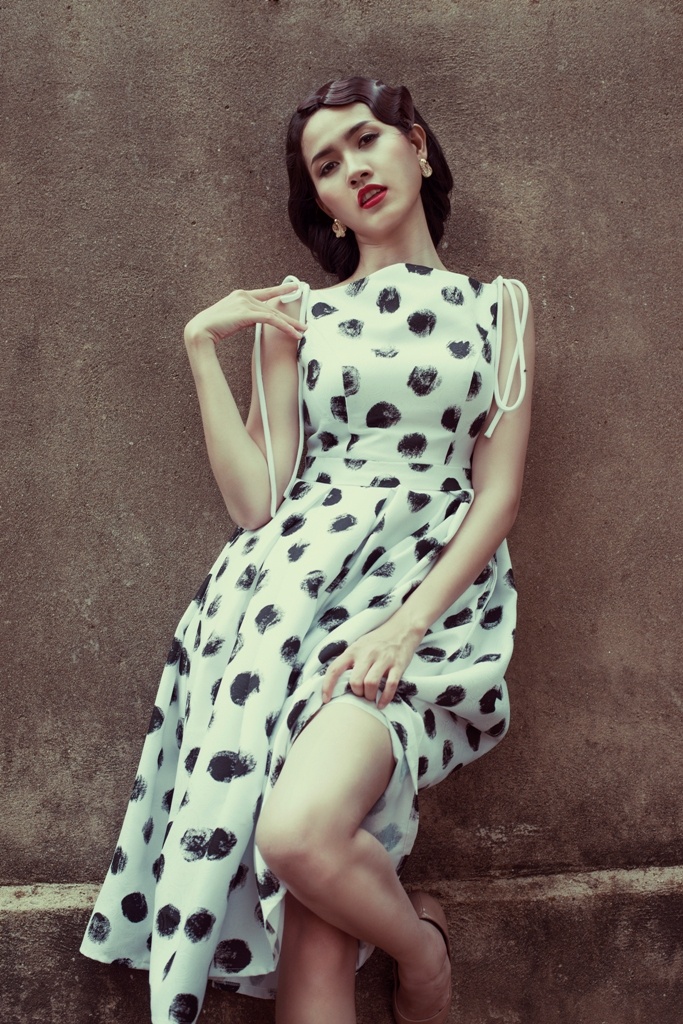 | Trong bộ ảnh vừa hoàn thành, Phan Thị Mơ hóa thân với hình tượng cổ điển. Top 5 Hoa hậu Việt Nam 2012 diện trang phục họa tiết chấm bi, mái tóc uốn xoăn tựa các quý cô thập niên trước. |