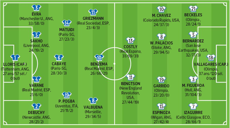 | Đội hình dự kiến theo tờ L'Equipe. (Chú thích dưới tên cầu thủ tương ứng với CLB đang khoác áo, giải đấu, tuổi, số lần ra sân ở ĐTQG và bàn thắng). |