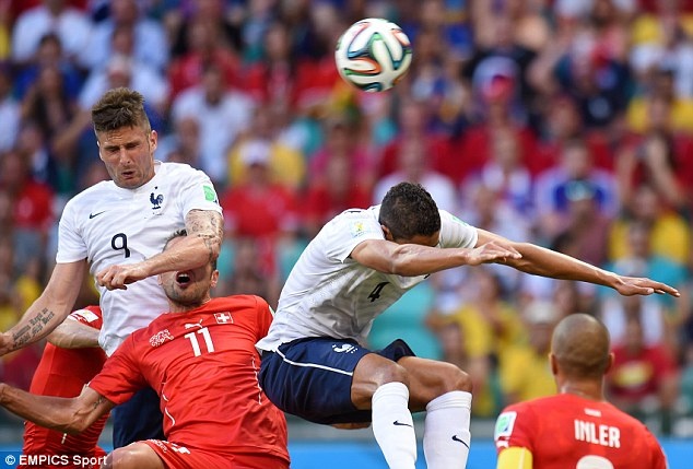 | Giroud đưa tuyển Pháp vượt lên dẫn trước Thụy Sỹ sau pha ghi bàn bằng đầu từ tình huống phạt góc ở phút 17. Đây là bàn thắng thứ 100 của Les Bleus ở World Cup. |