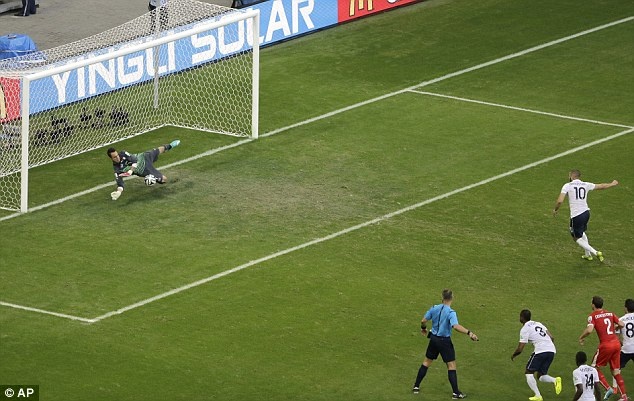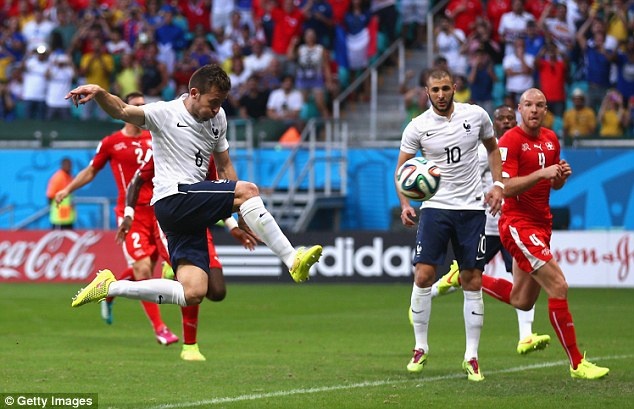 | Yohan Cabaye lao vào sút bồi sau pha cản phá penalty của thủ môn bên phía Thụy Sỹ, nhưng anh thực hiện cú volley đưa bóng dội xà. |