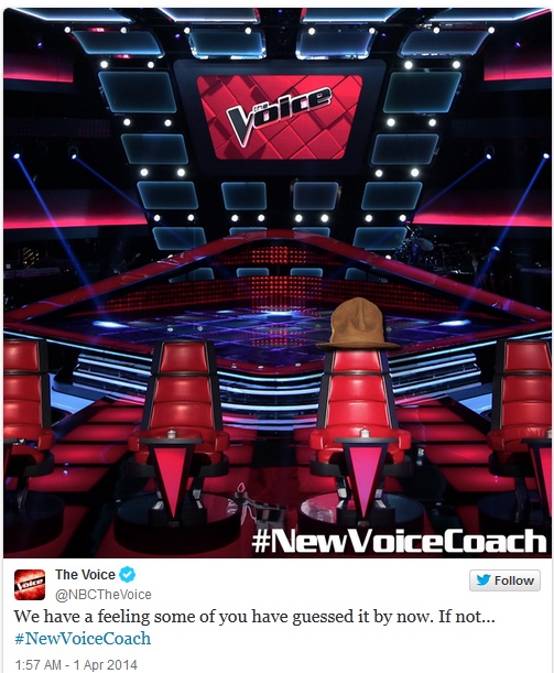 | Tin Pharrell Williams làm huấn luyện viên The Voice được công bố với chiếc mũ đặc trưng của anh. |