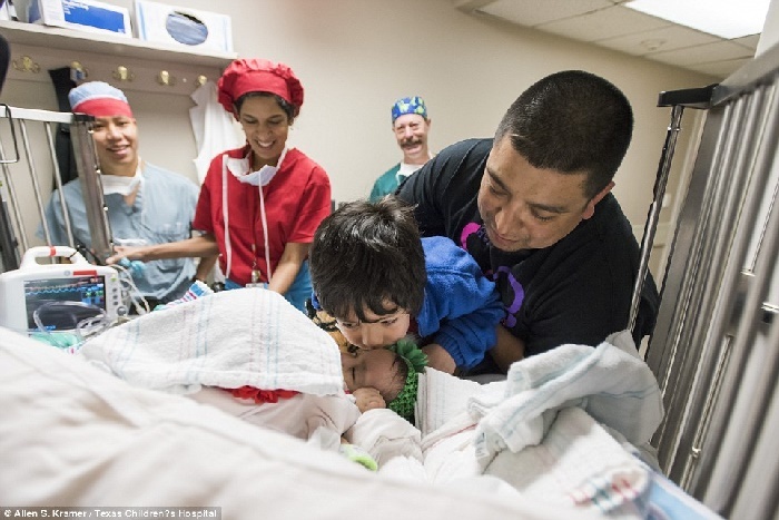 | Anh trai của hai bé gái, Azariah, 5 tuổi đã tặng mỗi cô bé một nụ hôn trước khi cuộc phẫu thuật diễn ra. |
