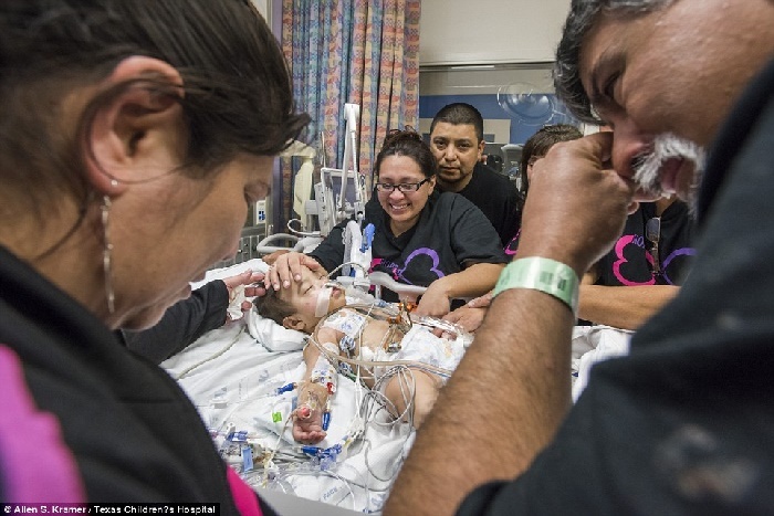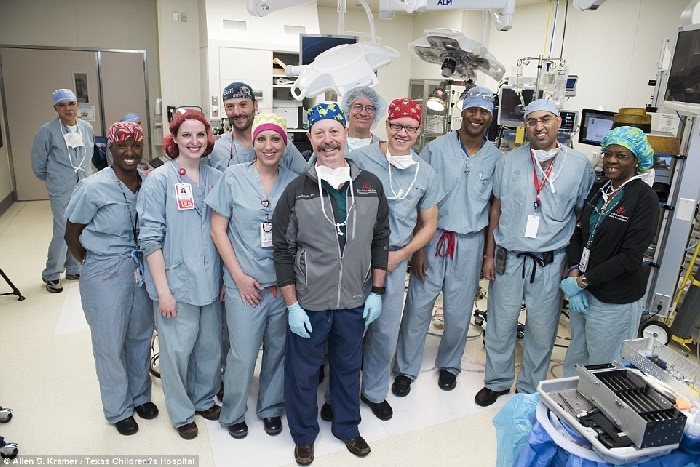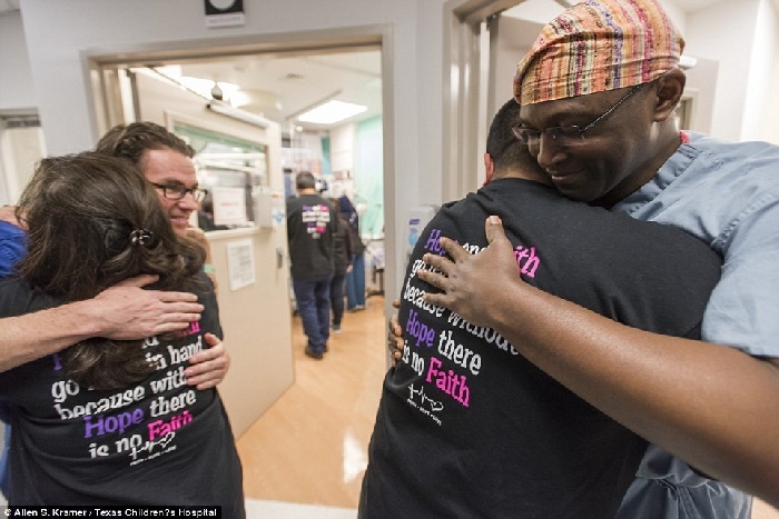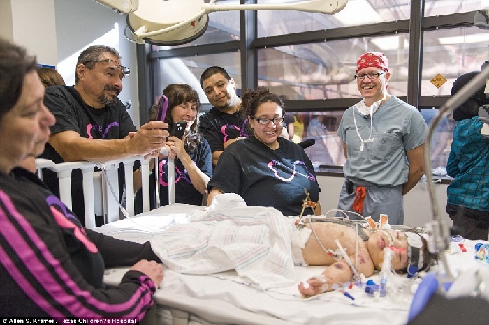 | Bác sĩ và các thành viên trong gia đình thăm cô con gái thứ hai sau cuộc phẫu thuật dài 26 tiếng. |