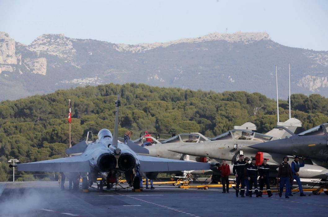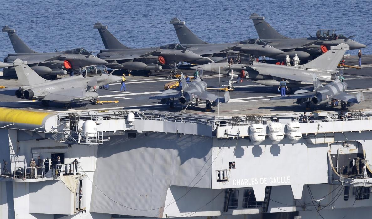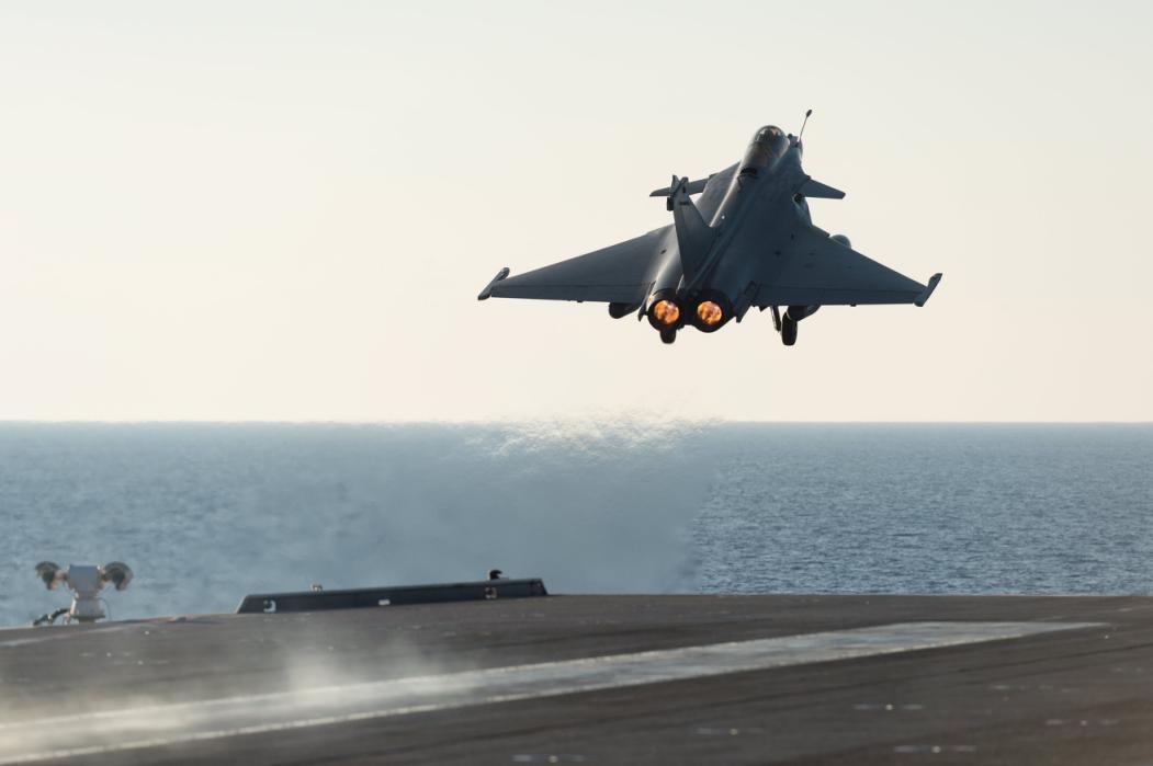 Chiến đấu cơ cất cánh từ tàu sân bay Charles De Gaulle trên Địa Trung Hải. Bộ Quốc phòng Pháp cho biết phi đội chiến đấu trên tàu sân bay bắt đầu chiến dịch dội bom IS hôm 23/11. Các mục tiêu nằm ở thành phố Ramadi và Mosul của Iraq. |