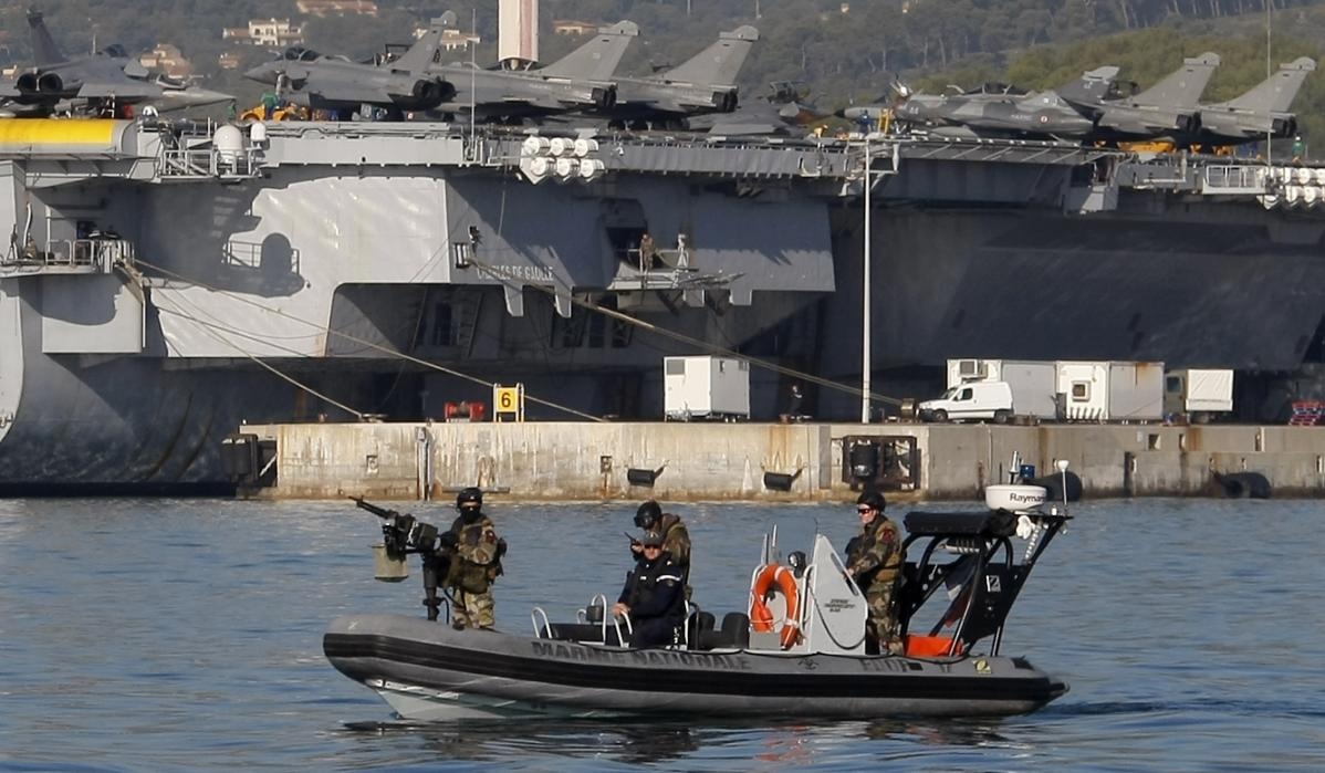 Trước khi Charles De Gaulle rời cảng, lực lượng đặc nhiệm Pháp tuần tra xung quanh tàu bằng xuồng cao tốc trang bị vũ khí hạng nặng và các thiết bị dò ngầm. |