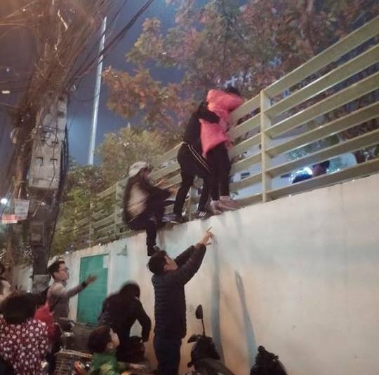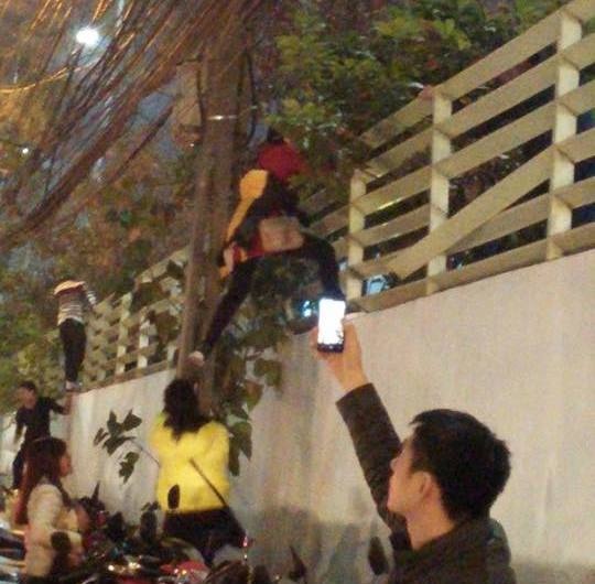 | Hình ảnh nhiều bạn trẻ giúp nhau trèo tường ra - vào trung tâm giải trí để xem cây thông cao nhất khiến dân mạng bức xúc. |