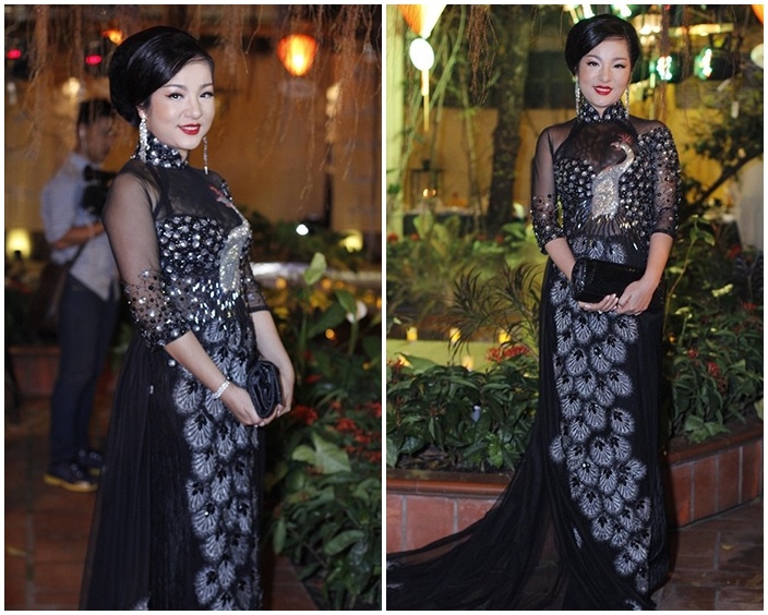 Danh hài Thúy Nga cũng có tên trong danh sách sao xấu tuần này với bộ áo dài truyền thống có quá nhiều chi tiết rườm rà rối mắt.