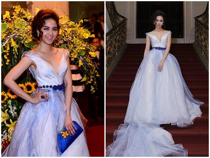 Diễn viên Đinh Ngọc Diệp chọn phong cách váy bồng xòe kiểu công chúa không phù hợp với độ tuổi. Mẫu váy nặng nề hơn với chi tiết thiết kế đuôi dài phủ đất.