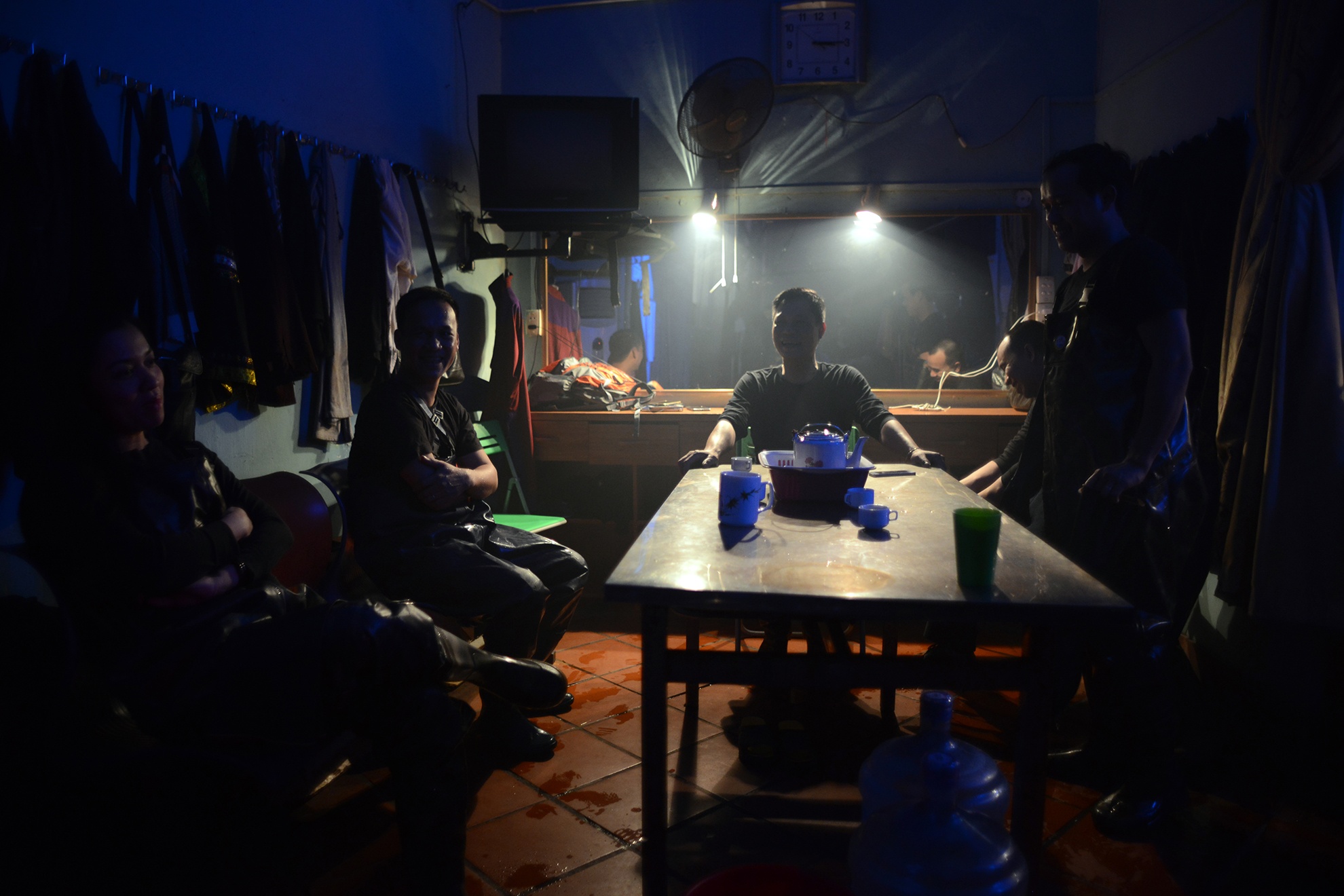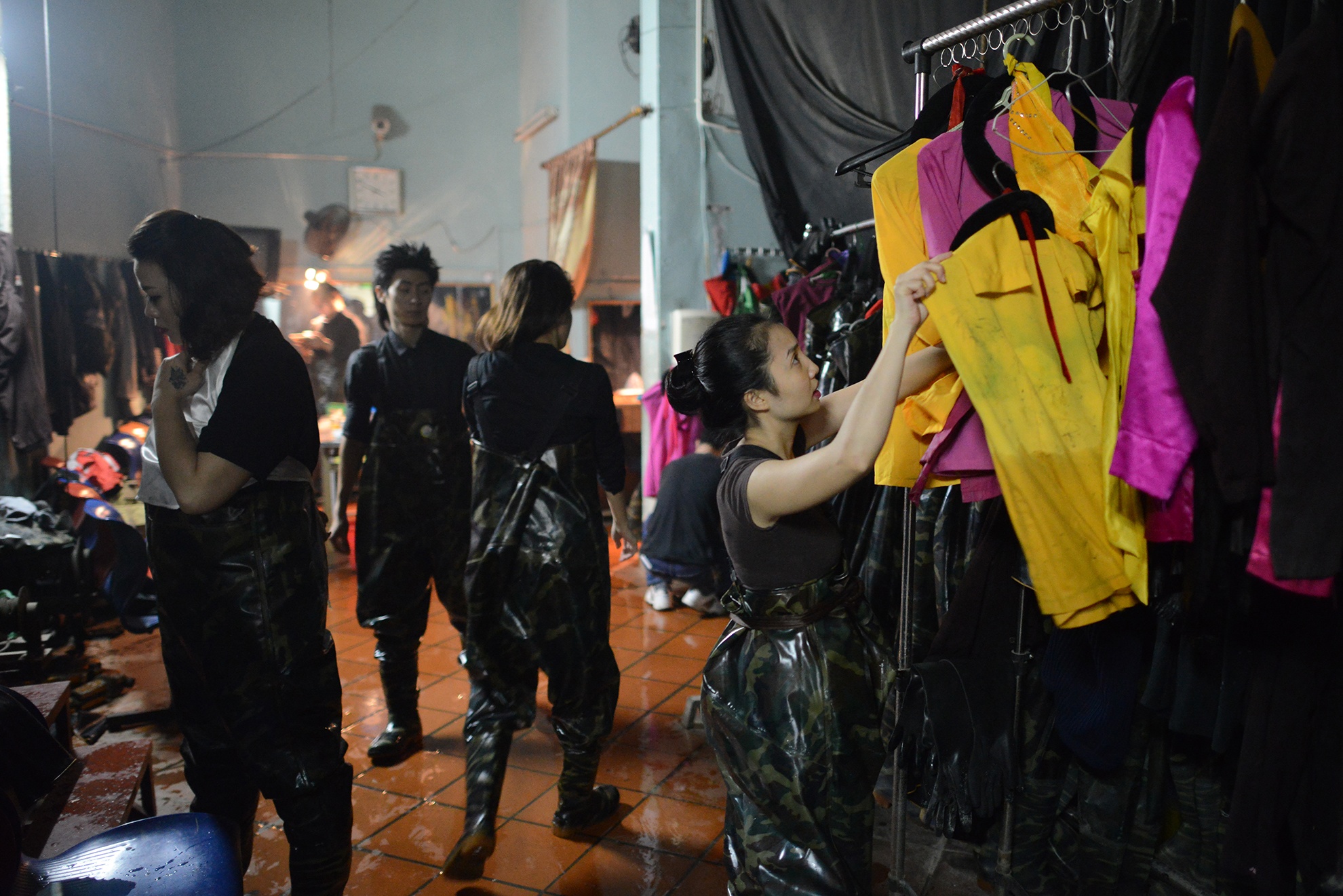 | Một số diễn viên nam tìm chỗ chợp mắt lấy sức cho ca diễn tiếp theo. |