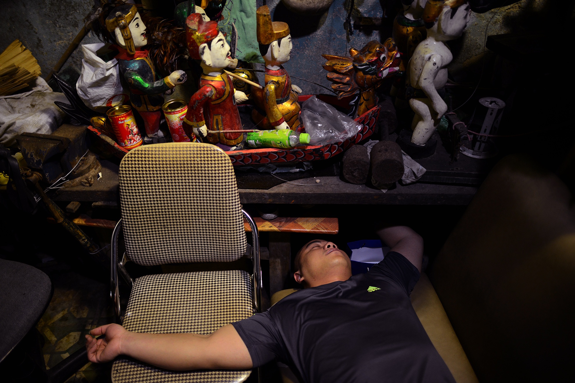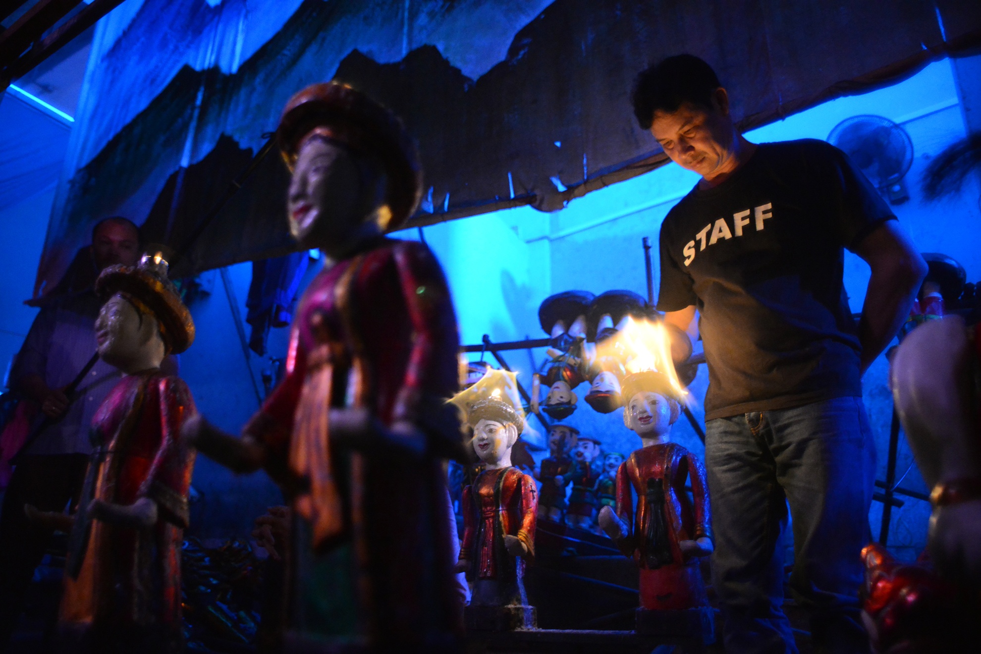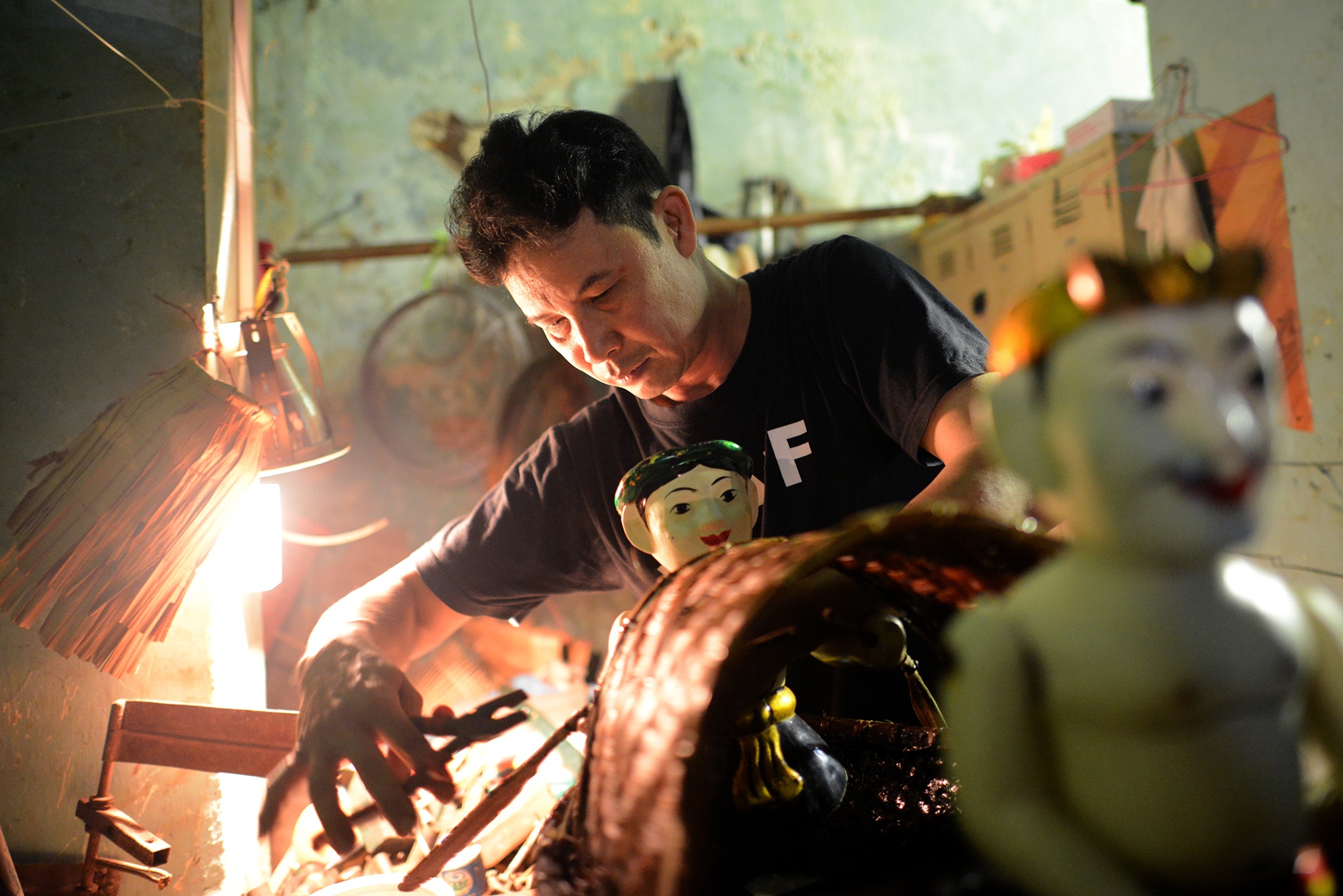 Đèn sân khấu tắt cũng là lúc góc cuối cánh gà chật hẹp sáng đèn. Nơi đây có người thợ chuyên sửa chữa rối Lê Quang Minh (49 tuổi). Anh đã gắn bó hơn 22 năm với nhà hát, chuyên làm lành cho các con rối hỏng hóc, trục trặc trong quá trình biểu diễn.