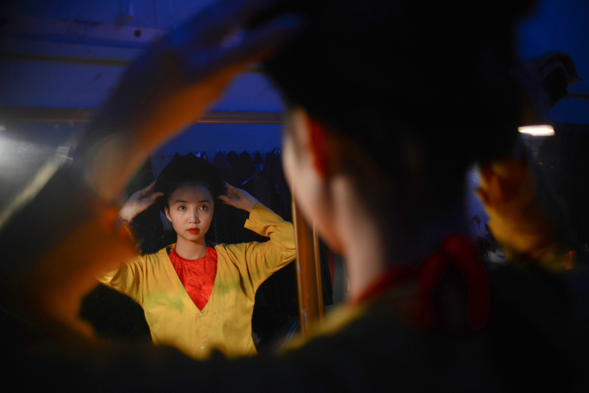 Nhưng họ vẫn luôn phải làm đẹp trước buổi biểu diễn để sau đó xuất hiện trước mắt khán giả vài giây cuối chào cảm ơn. Hình ảnh tại cánh gà nhà hát múa rối Thăng Long (57 Đinh Tiên Hoàng, Hà Nội).