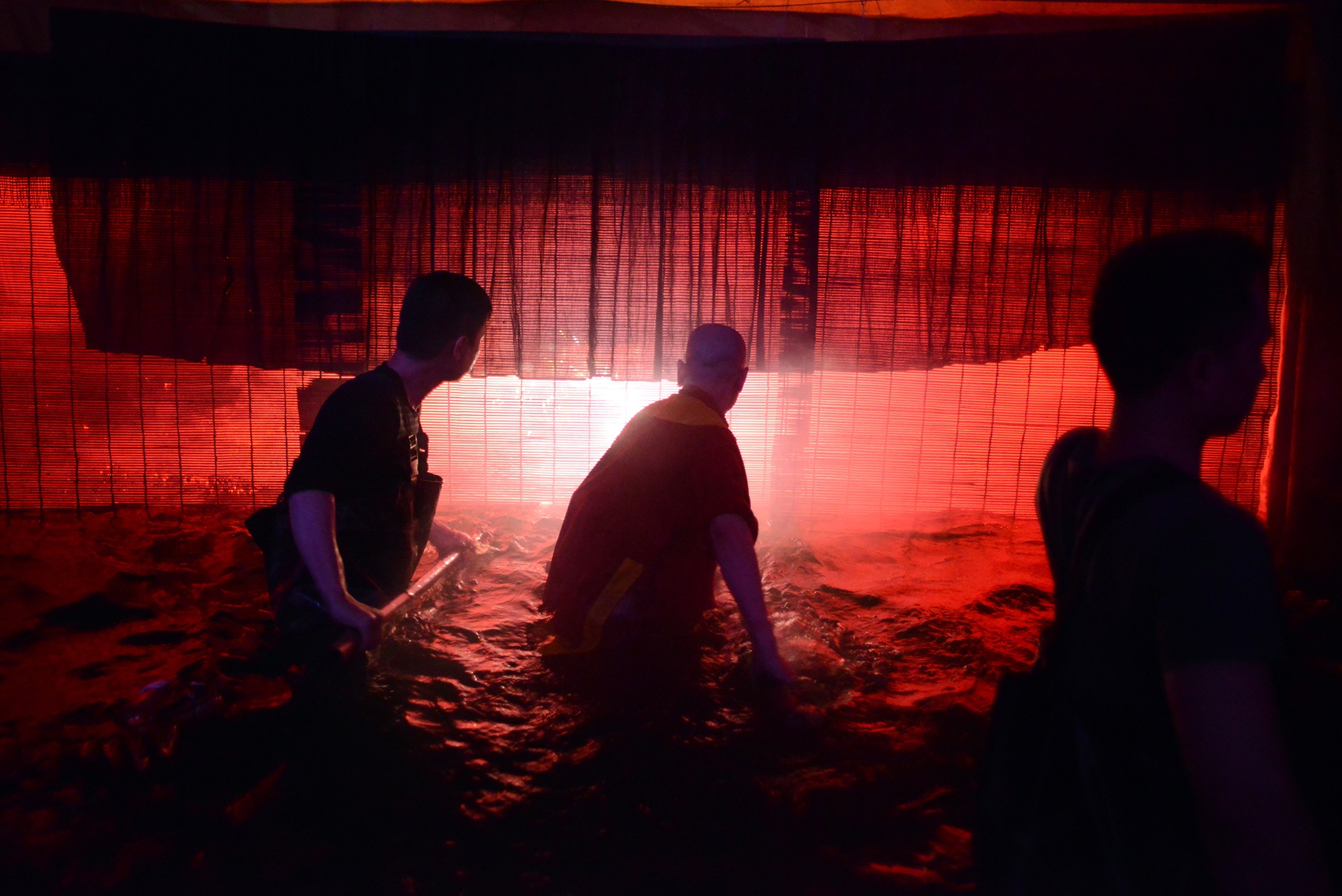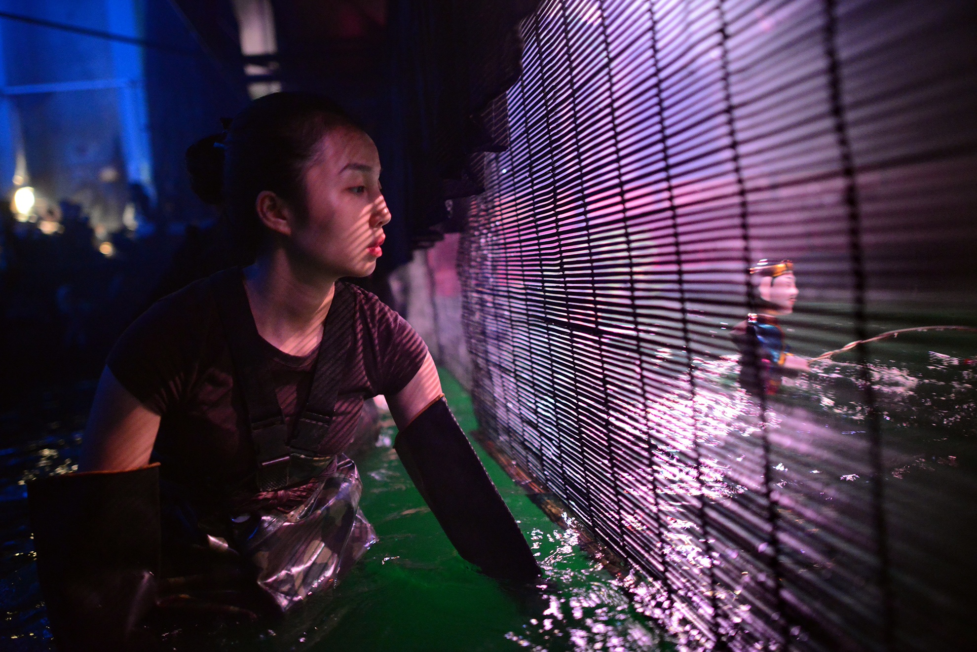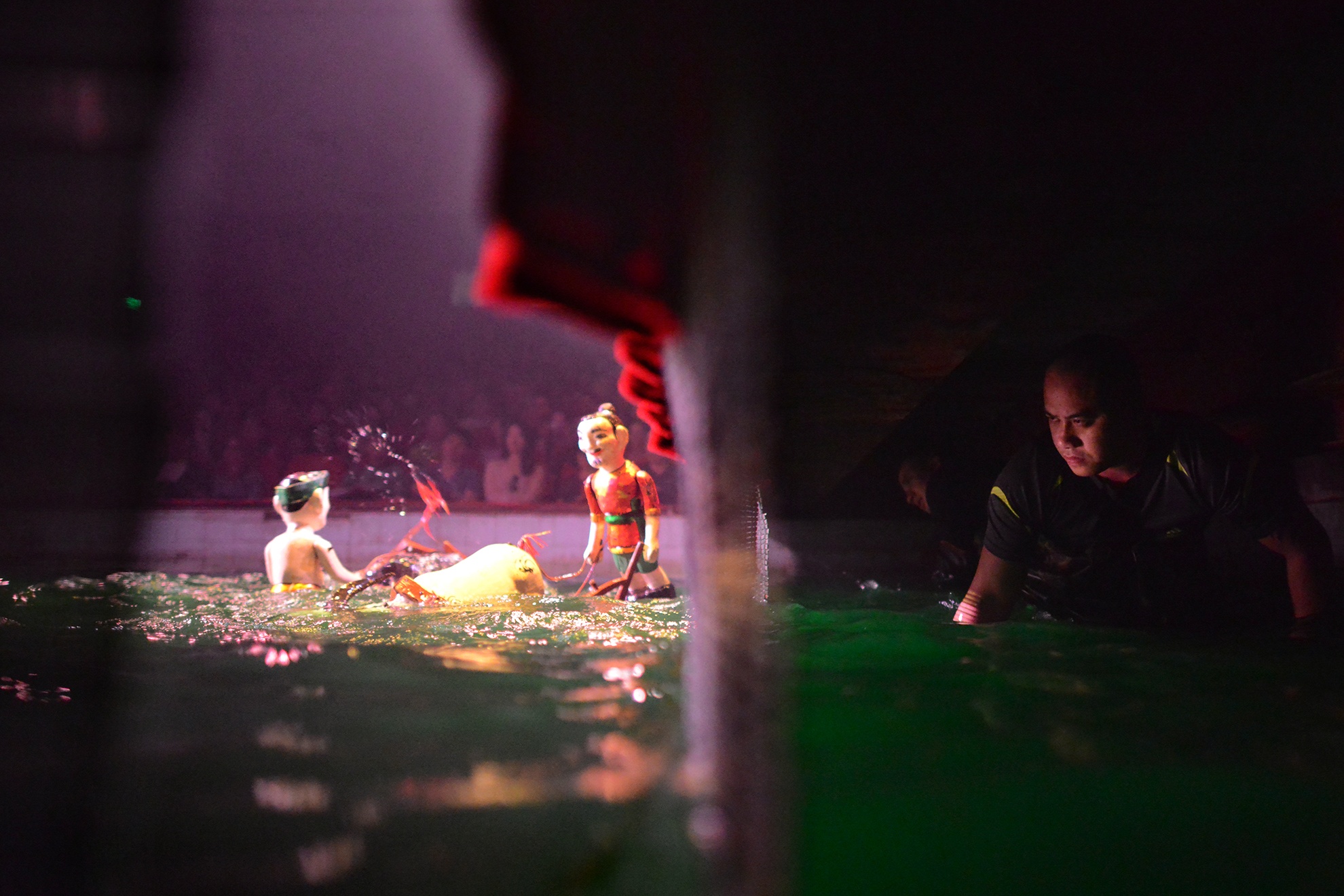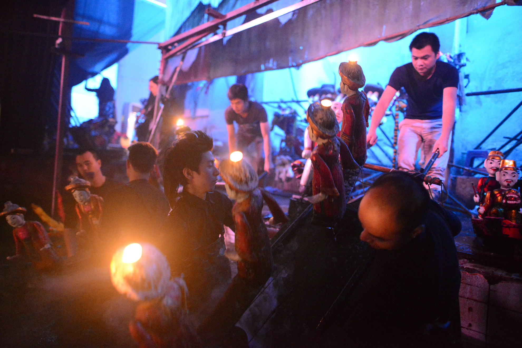 Sân khấu nước tại 57 Đinh Tiên Hoàng sâu gần 1 m, mỗi người cầm một chiếc sào điều khiển con rối lấp sau những chiếc mành. Một nghệ sĩ cho biết, trước đây khi chưa có những thiết bị như quần cao su, diễn viên thường phải ngâm trực tiếp thân mình dưới nước bất kể nhiệt độ nào. "Bởi vậy, các chứng viêm họng, cảm lạnh, đau lưng hay nhức xương khớp... xảy ra đối với chúng tôi là chuyện bình thường", anh nói.