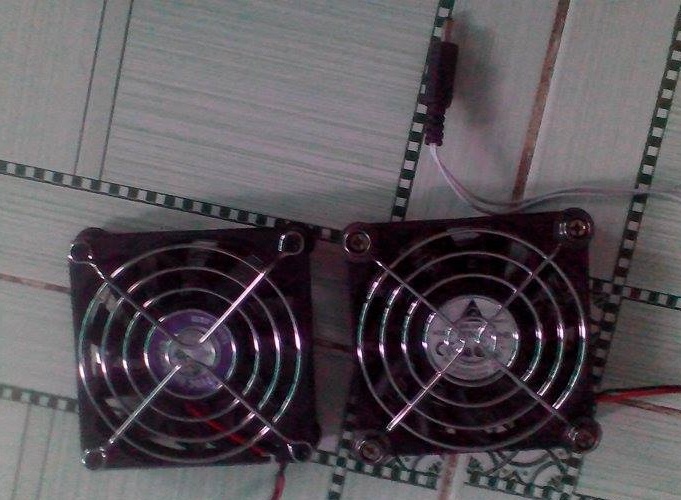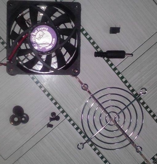 Bước 1: Chuẩn bị vật liệu gồm: 2 quạt máy tính 8x8x15 12V 0.4A (mm), jack nguồn DC, lưới chắn quạt, ốc vít, nút bấm áo khoác, vải lưới, áo khoác.