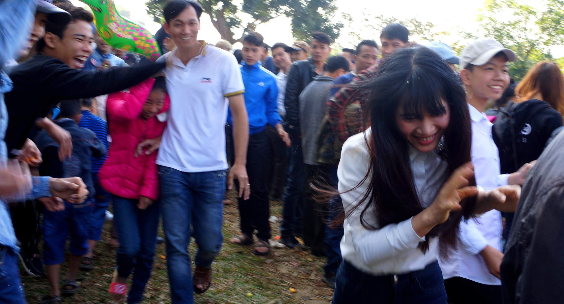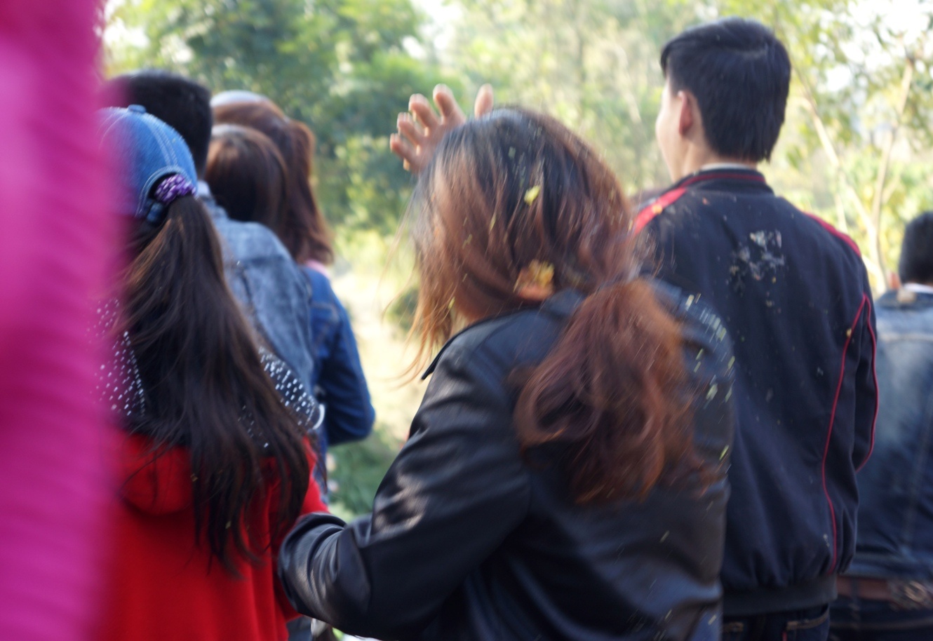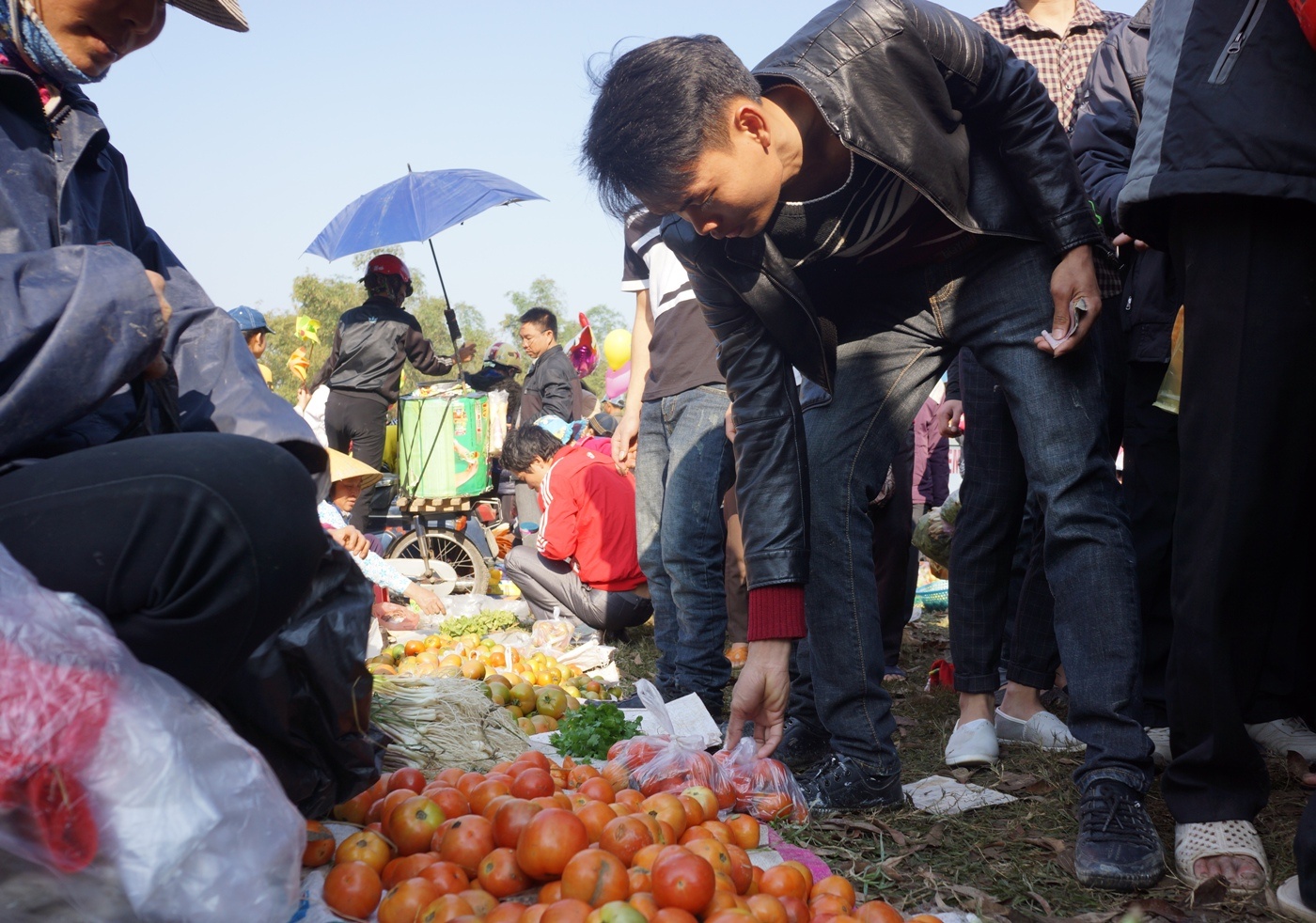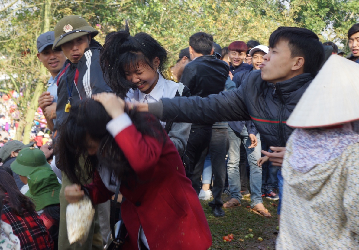 | Một cô gái bị nhóm trai làng chọc ghẹo, ném cà chua xù cả đầu tóc. Anh Nguyễn Thanh Tùng (24 tuổi, ở thị xã Sầm Sơn) cho biết đây là năm thứ hai cùng bạn bè đến tham dự hội chợ. "Tôi đến đây để du xuân và ném cà chua, đùa nghịch với bạn. Phiên chợ rất độc đáo lại diễn ra đầu năm nên rất vui. Chắc chắn tôi sẽ quay lại chợ Chuộng vào những năm sau" - anh Tùng vui vẻ nói. |
