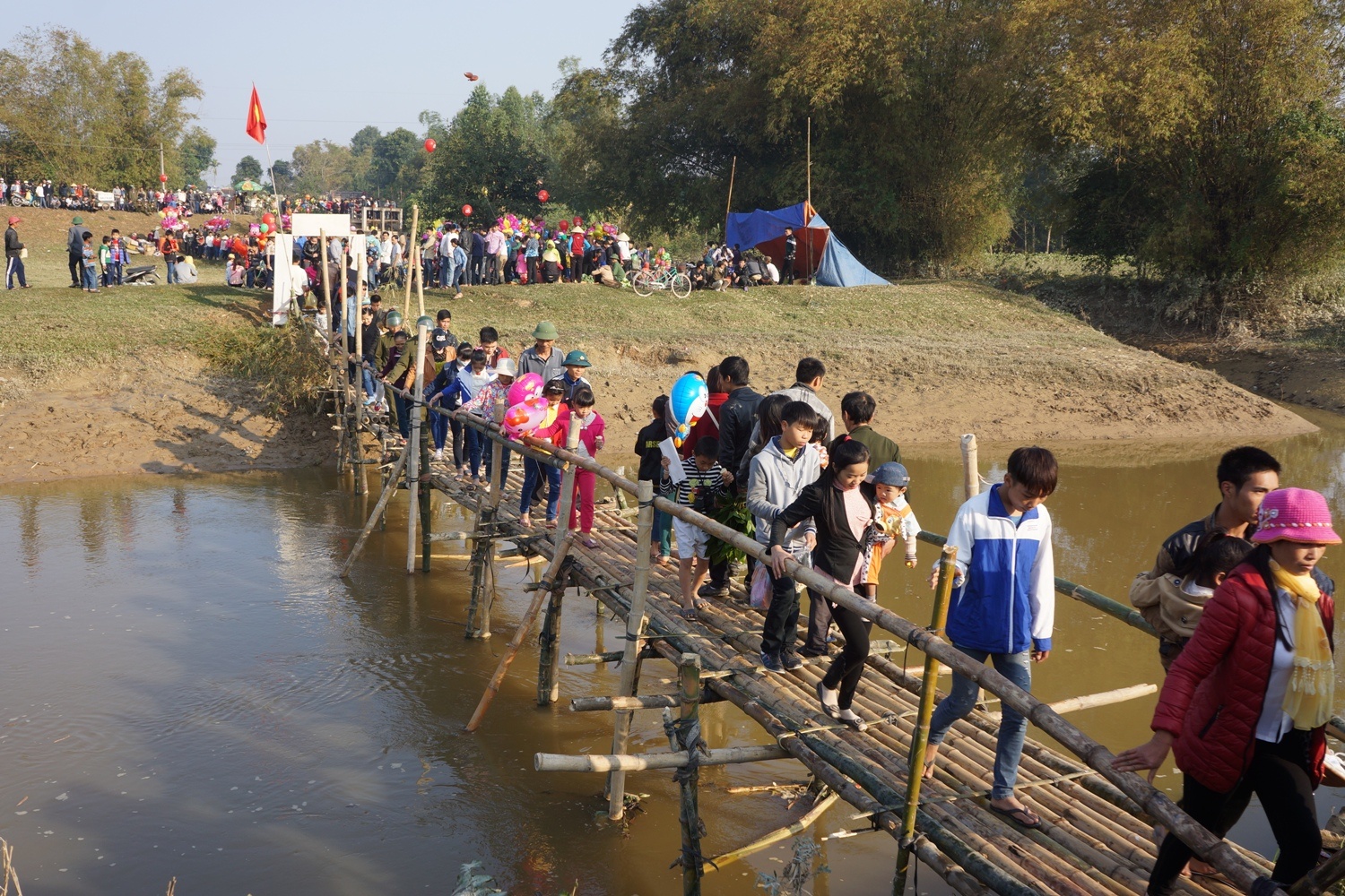 | Ngay từ mùng 5 Tết, người dân đã cùng nhau góp tre, nứa dựng một chiếc cầu khỉ bắc qua sông Hoàng để du khách từ huyện Triệu Sơn qua tham dự chợ nhanh hơn. |