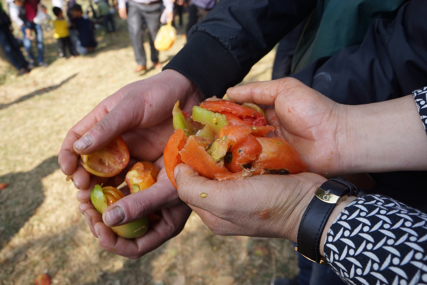 | Nét độc đáo của phiên chợ là mọi người dùng cà chua chín đỏ làm "vũ khí" để ném vào nhau. |