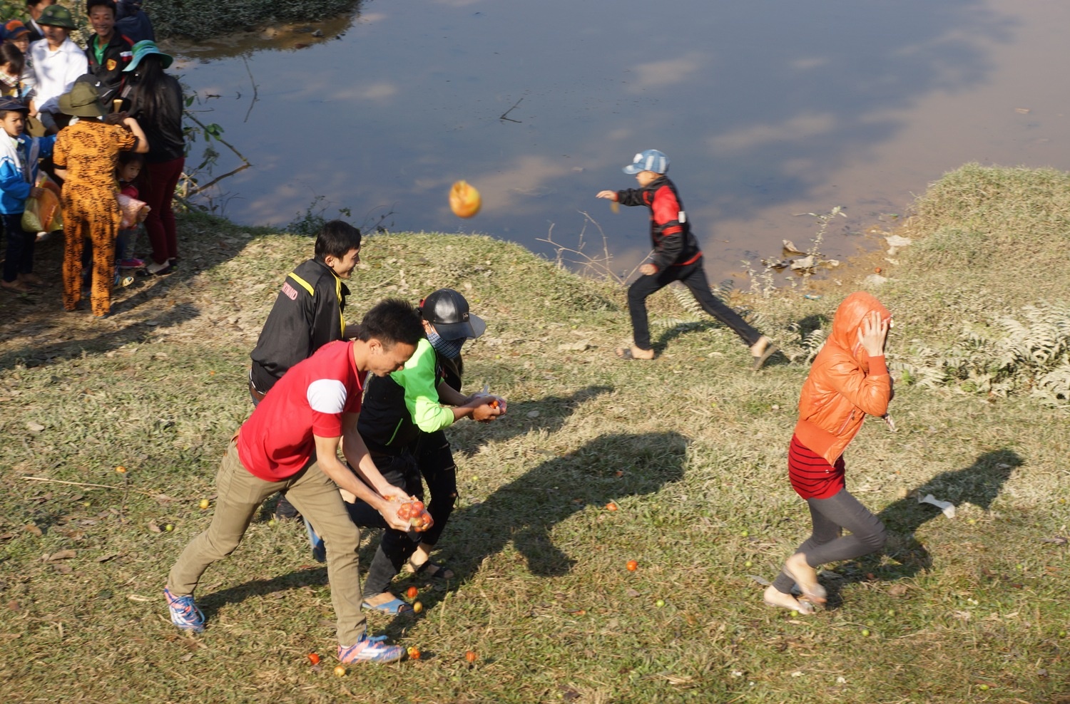 | Không những ném từ xa, nhiều bạn trẻ còn rượt đuổi, xát cả trái cà chua chín đã nát lên đầu nhau. |