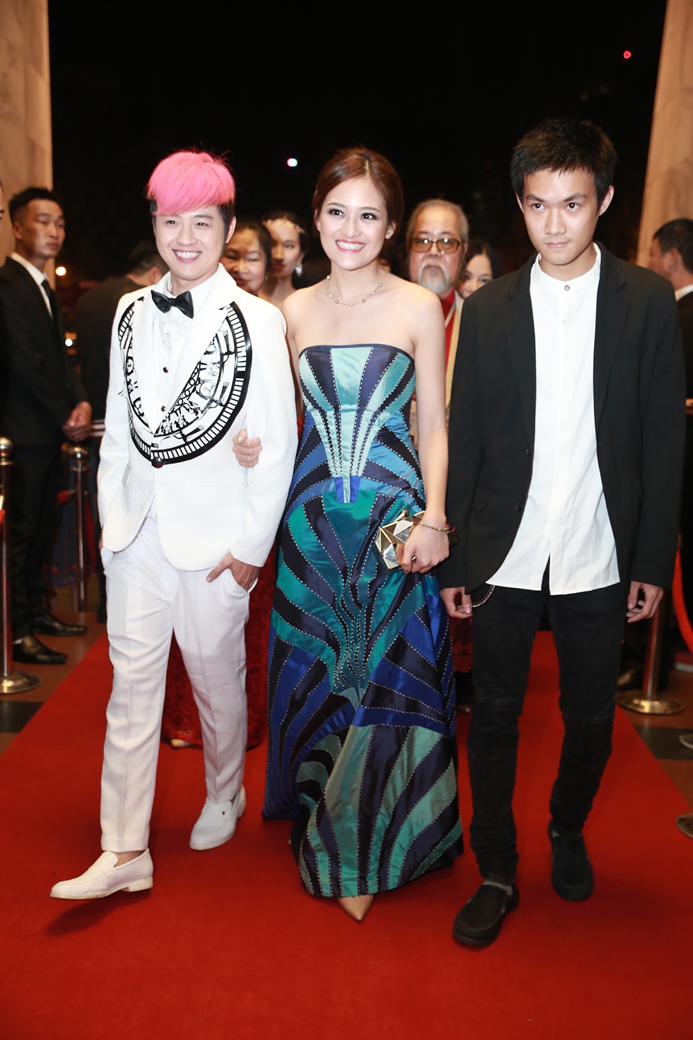| Ba diễn viên chính của Đập cánh giữa không trung trên thảm đỏ của đêm bế mạc và lễ trao giải HANIFF 2014: Thanh Duy, Thùy Anh, Hoàng Hà. Nam diễn viên Trần Bảo Sơn không có mặt để tham gia bế mạc trao giải. Ảnh: Hải Bá |