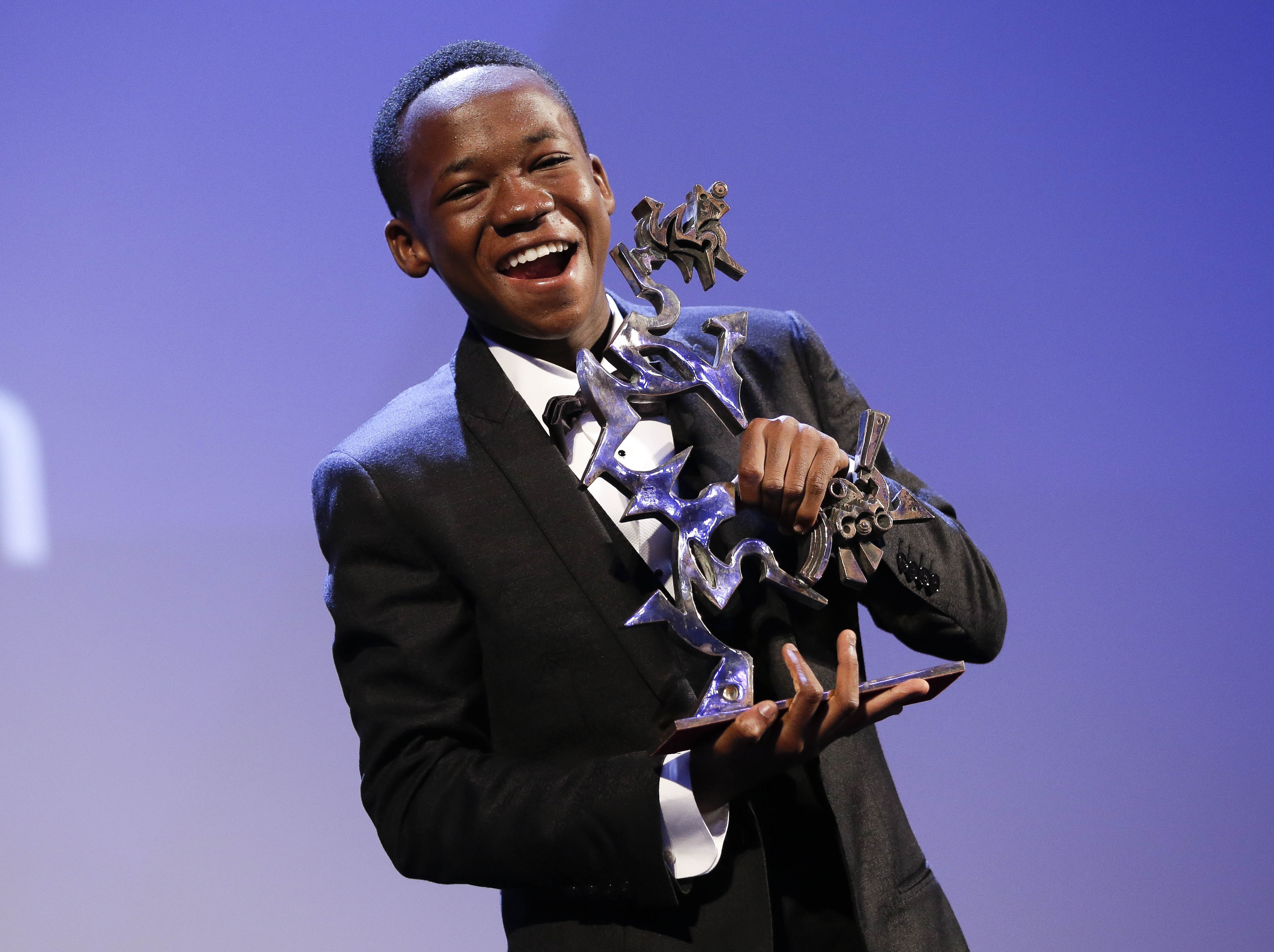 | Cậu bé 14 tuổi Abraham Attah với giải thưởng Marcello Mastroianni trên tay. |
