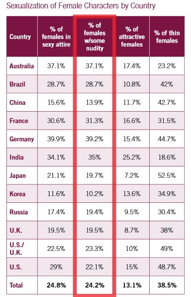 Các bộ phim do Anh - Mỹ hợp tác sản xuất có tỷ lệ 23,3% và thậm chí còn cao hơn cả các bộ phim thuần Hollywood với mức 22,1%. Xét một cách tổng quan, có tới gần 25% số lượng các nhân vật nữ trên toàn cầu có một cảnh khỏa thân nào đó trong phim suốt năm qua.