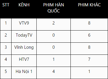 Như vậy, chỉ có duy nhất trên kênh truyền hình Hà Nội 1 phim Hàn Quốc còn chiếm tỷ lệ cao. 2 kênh TodayTV và Vĩnh Long đã nói không với phim Hàn Quốc ở thời điểm này.