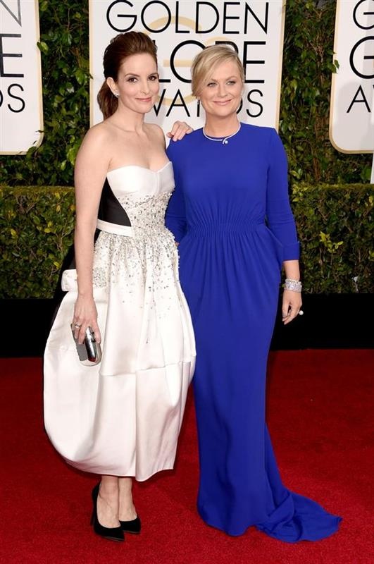 Tina Fey và Amy Poehler trên thảm đỏ của lễ trao giải thưởng Quả cầu vàng 2015. Họ đùa là đã chuẩn bị 50 bộ xiêm y và 10 trạng thái biểu cảm khác nhau cho sự kiện. |