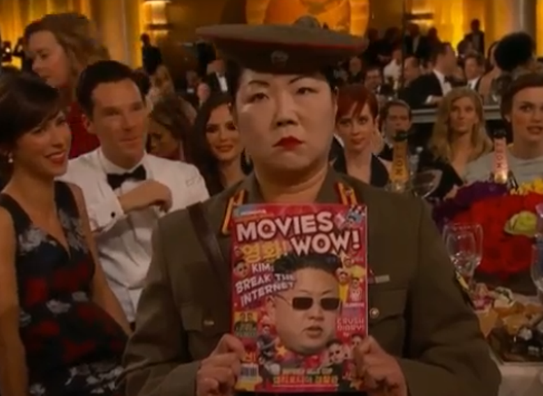 Margaret Cho giả làm nữ binh Bắc Hàn tại lễ trao giải thưởng Quả cầu vàng 2015. |