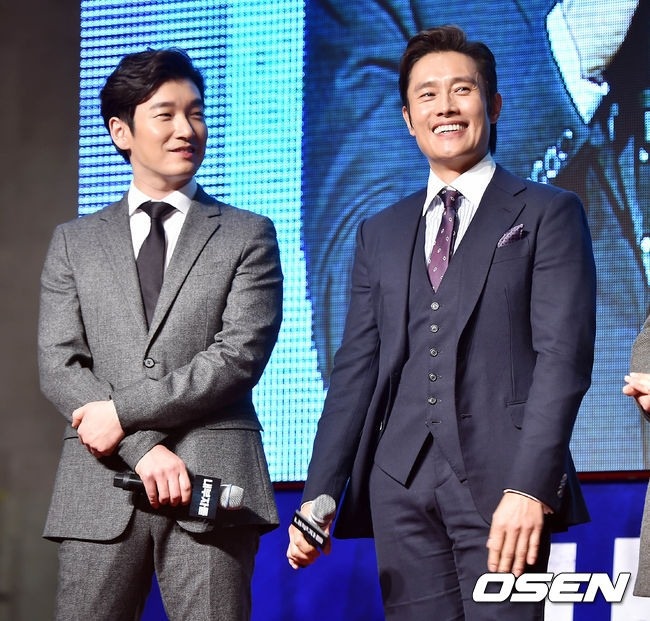 | Lee Byung Hun (phải) và Jo Seung Woo tại buổi họp báo ra mắt Inside men. Ảnh: Osen |