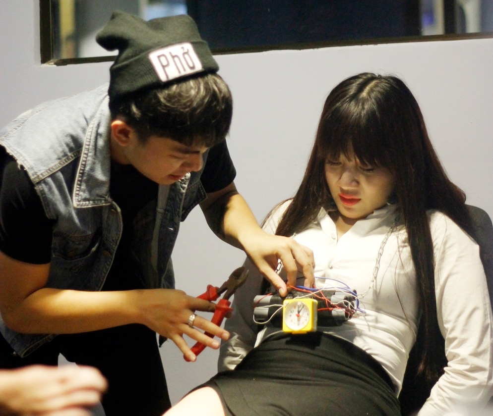 | Phở Đặc Biệt thực hành gỡ bom trên người Milan. Đây được dự đoán là cảnh gay cấn nhất Phở 9. |