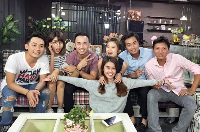 | Phở Đặc Biệt, Ngọc Thảo tạo dáng bên cạnh đạo diễn Hữu Trọng và dàn diễn viên của 5S Online tại phim trường. Ảnh: NVCC. |