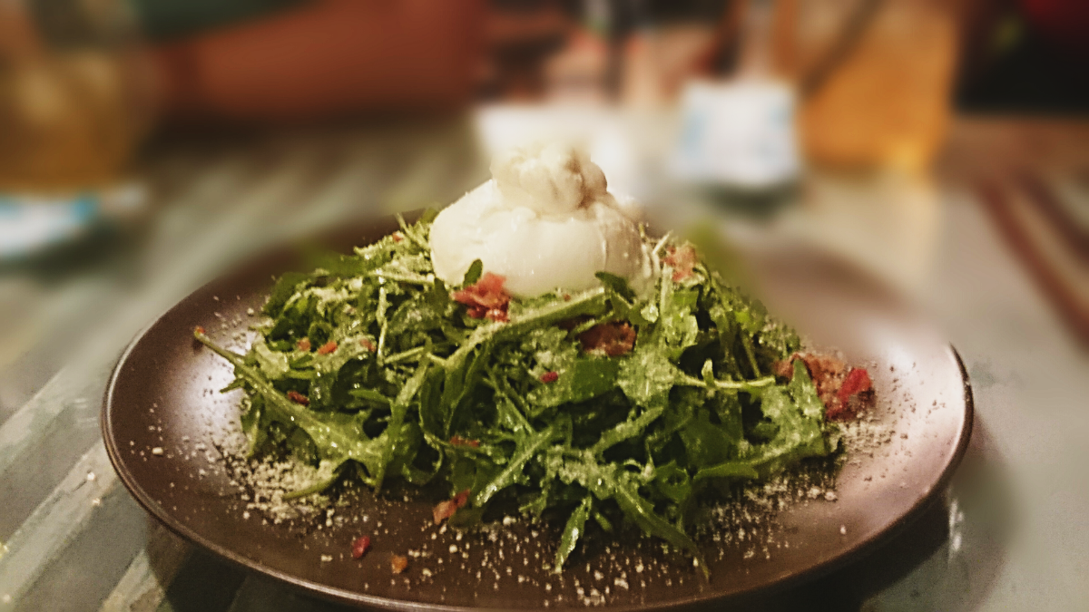 Burrata và Rocket Burrata gồm phô mai hồ lô dẻo từ mozarella tươi, cuốn với cream béo ngậy. Khi cắt vào giữa, vỏ mozarella vỡ ra để lớp kem trắng nõn mịn màng. |