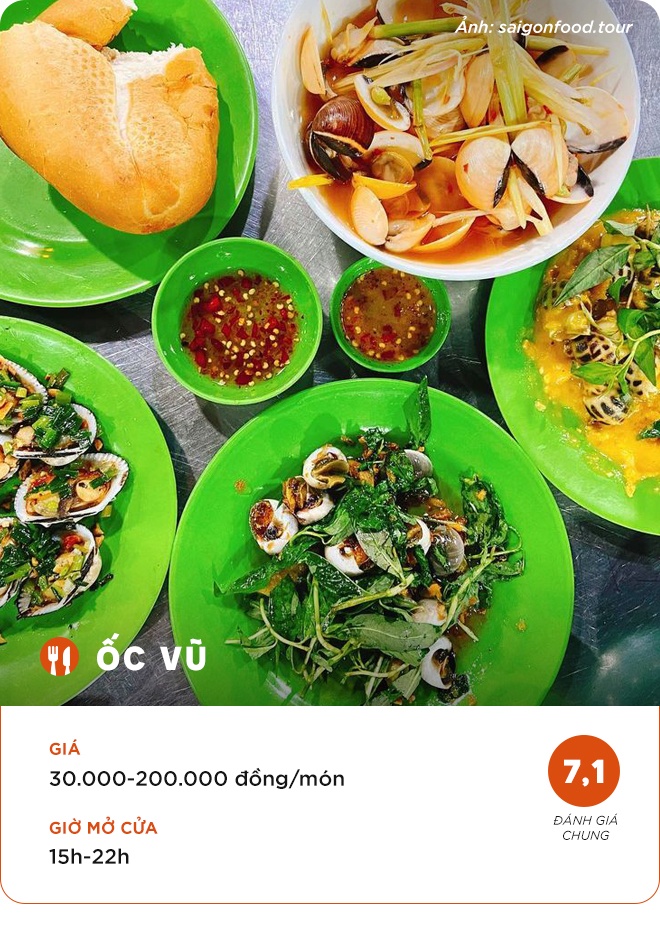 Với mức giá chừng 100.000-150.000 đồng/người, thực khách có thể cùng bạn bè nhâm nhi hương vị ốc đậm đà tại con đường Vĩnh Khánh. Trong nhiều hàng quán sáng đèn đến nửa đêm, Ốc Vũ, Ốc Thảo, Ốc Bụi... là địa chỉ bạn có thể tham khảo.