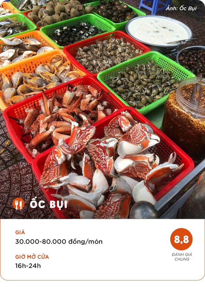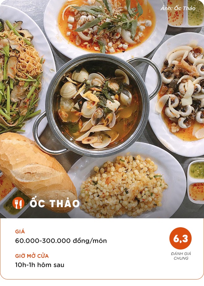 Minnie Pham: "Quán nằm ở đầu đường Vĩnh Khánh nên dễ tìm, không gian rộng rãi. Mình gọi ốc bươu hấp sả chấm với nước mắm ăn ổn nhưng sẽ ngon hơn nếu có mắm gừng. Mì xào ốc giác một phần khá nhiều. Ốc mỡ sa tế ăn ngon".