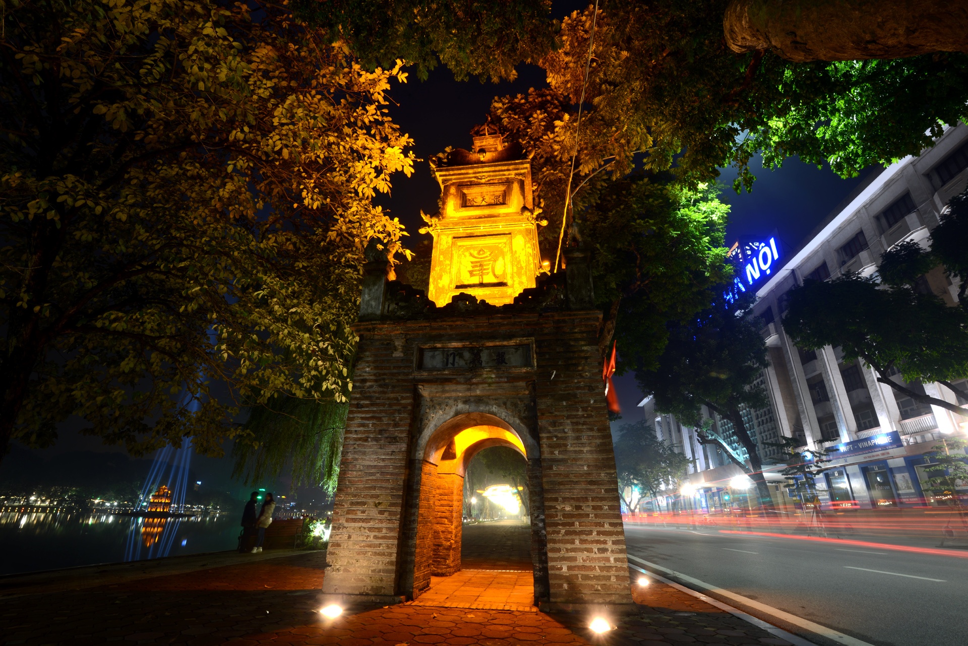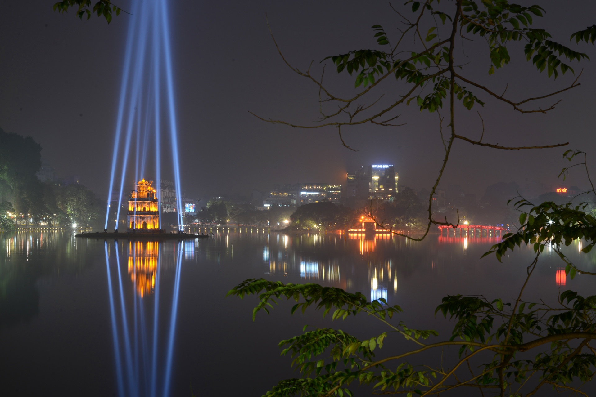 | Hồ Gươm lung linh sắc màu ánh sáng về đêm. |