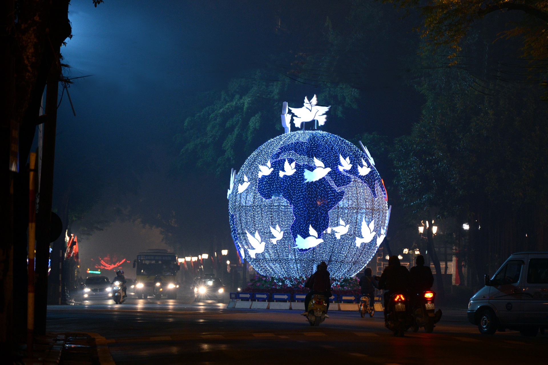| Biểu tượng trái đất trên đài sen trước cửa Nhà hát Lớn rực sáng về đêm. |
