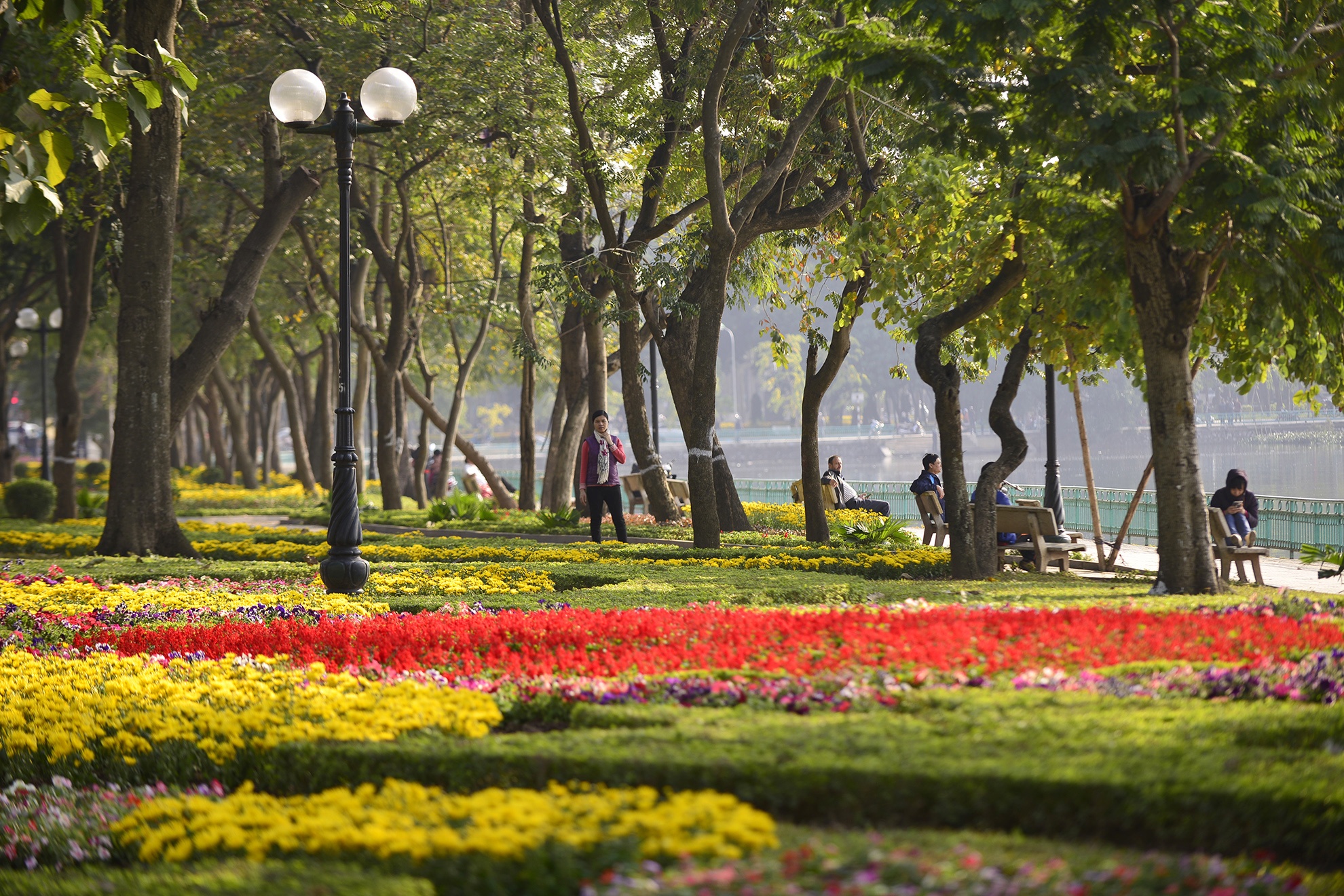 | Một số người dân đi hóng nắng bên hồ Tây trên đường Thanh Niên. |