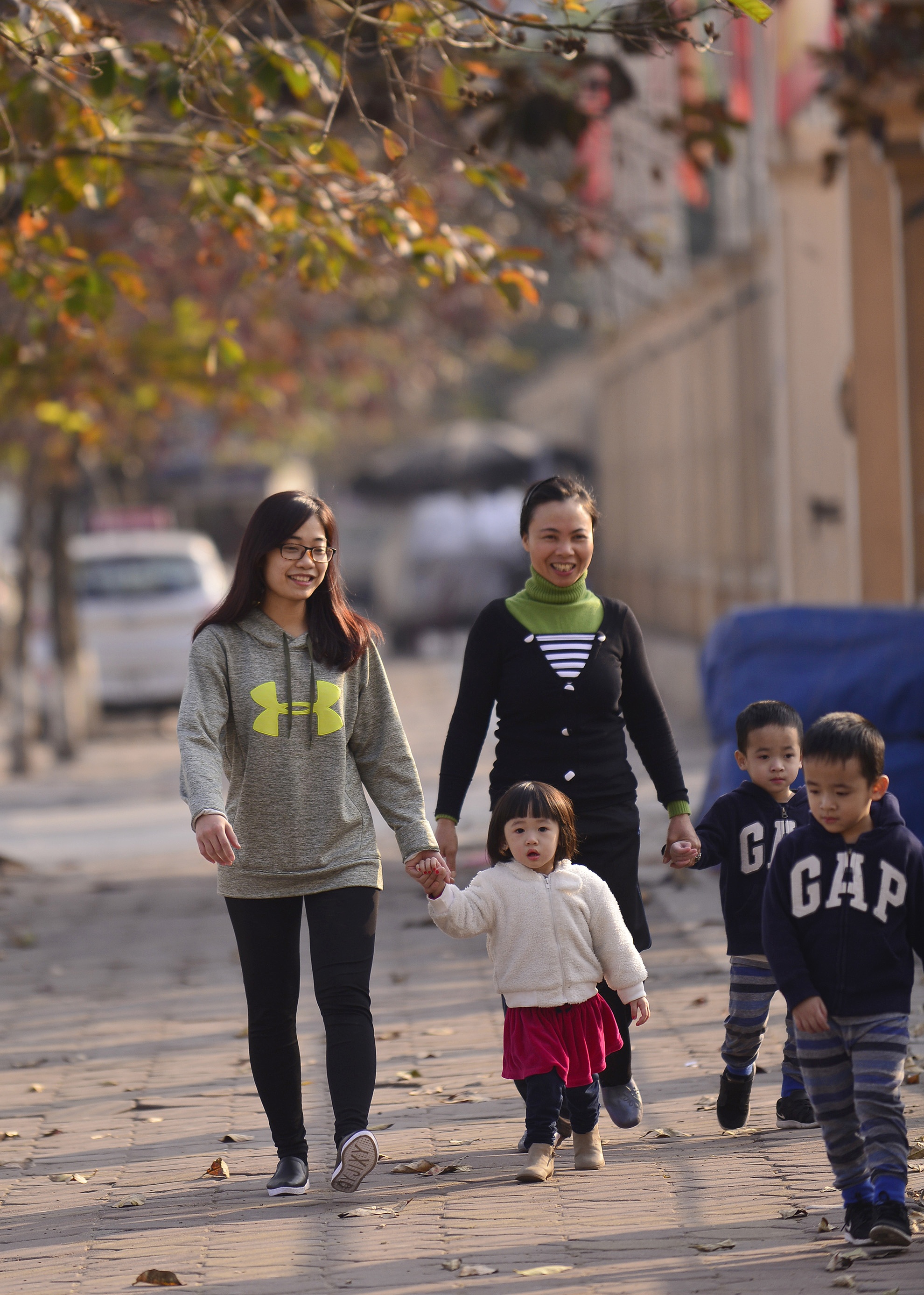| Nhiều gia đình dạo chơi, tận hưởng không khí thanh bình trên phố Văn Cao. |