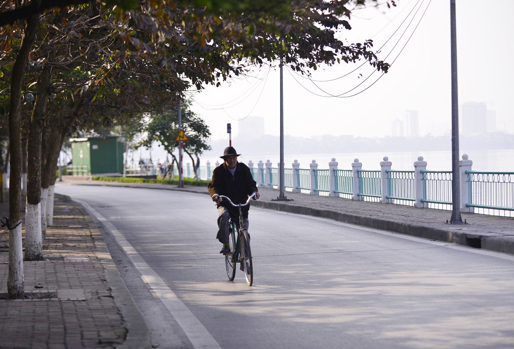 | Cụ ông thong thả đạp xe ven hồ Tây. |