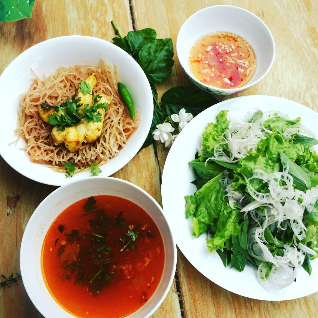 Cách thưởng thức phở sắn thường thấy là sau khi ngâm qua nước, để ráo, người ta sẽ chan nước nhưn (nhân) nấu với cá như cá nục, cá ngừ, cá lóc, rồi thêm vào rau thơm, thân chuối non xắt mỏng... Ngày nay, trong các nhà hàng, phở sắn Quế Sơn còn được biến tấu thành nhiều món ngon khác có phần cầu kỳ hơn. Ảnh: Healthy.noodles. |