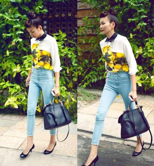 | Thanh Hằng tiếp tục ghi điểm với sơ mi họa tiết và quần jeans sáng màu. |