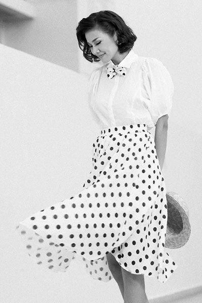 | Nàng Kiều thị trông như một quý cô thập niên 1990 khi kết hợp sơ mi trắng với midi chấm bi. |