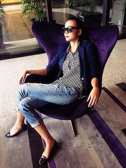 | Thanh Hằng bụi bặm nhưng "chất" khi mặc chiếc sơ mi kẻ sọc, khoác ngoài blazer xanh tím than kết hợp cùng quần jeans rách. |