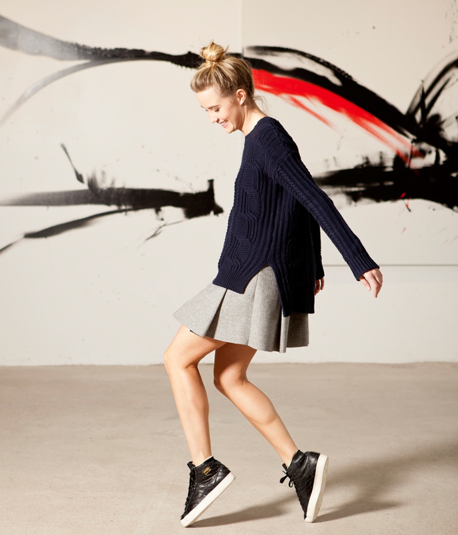 | Nhiều người nghĩ rằng không thể mặc đồ nữ tính với giày thể thao nhưng điều đó là sai lầm. Váy ngắn dáng chữ A, áo len trơn màu có thể mix với đôi giày thể thao cùng tông áo. |